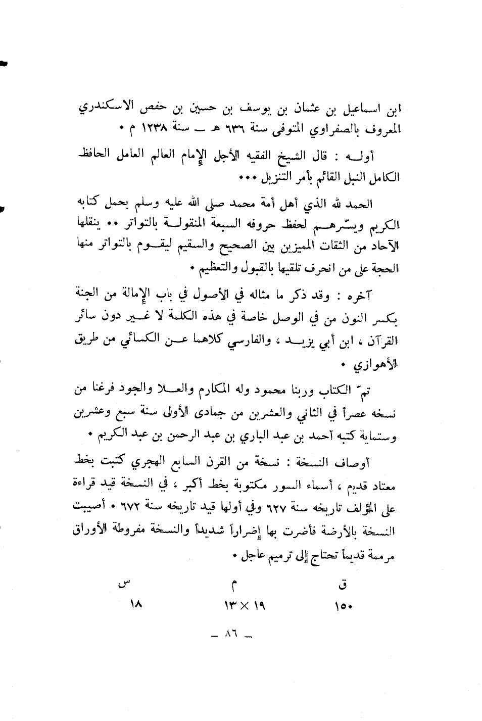 أوله: قال الشيخ الفقيه الأجل الإمام العالم العامل الحافظ الكامل النبل القائم بأمر التنزيل ...