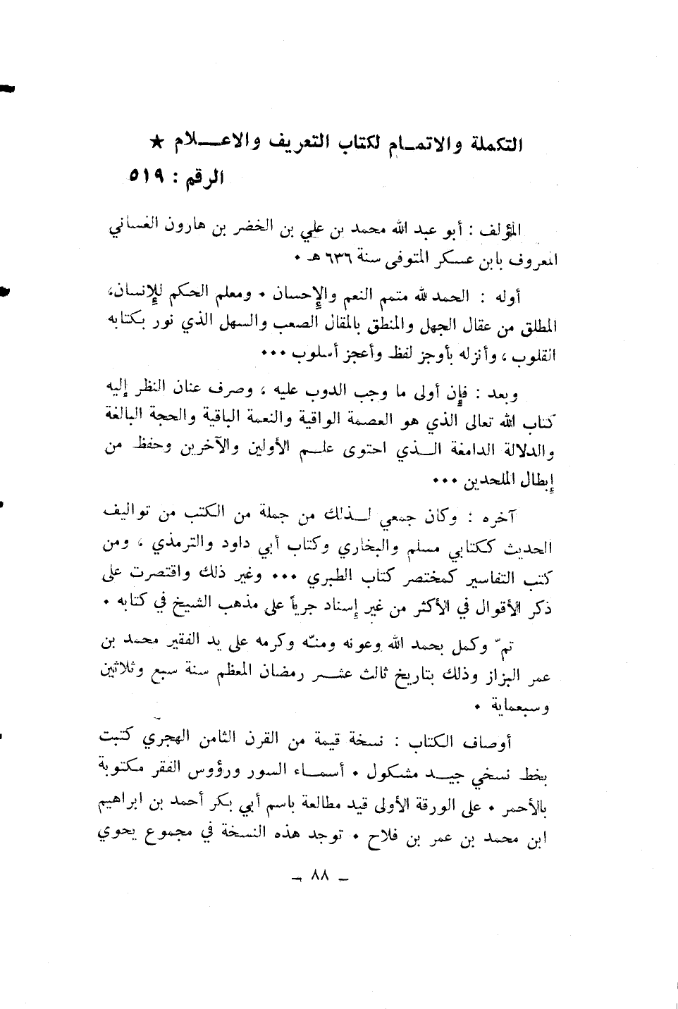 التكملة والاتمام لكتاب التعريف والاعلام* الرقم: 519