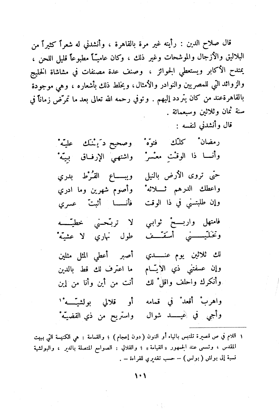 (1) اللام في ص قصيرة تلتبس بالياء أو النون (دون إعجام) ؛ والقمامة: هي الكنيسة التي ببيت المقدس، وتسمى عند الجمهور ((القيامة)) ؛ والقلالي: الصوامع المتصلة بالدير، والبولشية نسبة إلى بولش (بولس) - حسب تقديري للقراءة -.