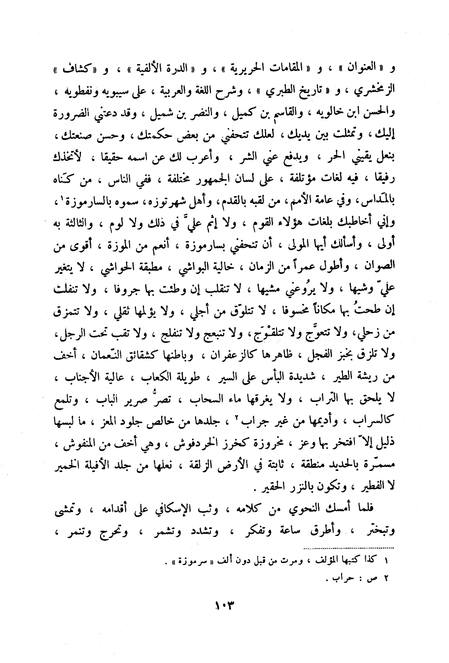 والعنوان والمقامات الحريرية، والدرة الألفية، وكشاف الزمخشري، وتاريخ الطبري، وشرح اللغة والعربية، على سيبويه ونفطويه، والحسن ابن خالويه، والقاسم بن كميل، والنضر بن شميل، وقد دعتني الضرورة إليك، وتمثلت بين يديك، لعلك تتحفني من بعض حكمتك، وحسن صنعتك، بنعل يقيني الحر، ويدفع عني الشر، وأعرب لك عن اسمه حقيقا، لأتخذك رفيقا، فيه لغات مؤتلفة، من لقبه بالقدم، وأهل شهرتوزة، سموه بالسارموزة (1) ، وإني أخاطبك بلغات هؤلاء القوم، ولا إثم علي في ذلك ولا لوم، والثالثة به أولى، وأسألك أيها المولى، أن تتحفني بسارموزة، أنعم من الموزة، أقوى من الصوان، وأطول عمراً من الزمان، خالية البواشي، مطبقة الحواشي، لا يتغير على وشيها، ولا يروعني مشيها، لا تنقلب إن وطئت بها جروفا، ولا تنفلت إن طحت بها مكاناً مخسوفا، لا تتلوق من أجلي، ولا يؤلمها ثقلي، ولا تتمزق من زحلي، ولا تتعوج ولا تتلقوج، ولا تنبعج ولا تنفلج، ولا تقب تحت الرجل، ولا تلزق بخبز الفجل، ظاهرها كالزعفران، وباطنها كشقائق النعمان، أخف من ريشة الطير، شديدة البأس على السير، طويلة الكعاب، عالية الأجناب، لا يلحق بها التراب، ولا يغرقها ماء السحاب، تصر صرير الباب، وتلمع كالسراب، وأديمها من غير جراب (2) ، جلدها من خالص جلود المعز، ما لبسها ذليل إلا افتخر بها وعز، مخروزة كخرز الخردفوش، وهي أخف من المنقوش، مسمرة بالحديد منطقة، ثابتة في الأرض الزلقة، نعلها من جلد الأفيلة الخمير لا الفطير، وتكون بالنزر الحقير.