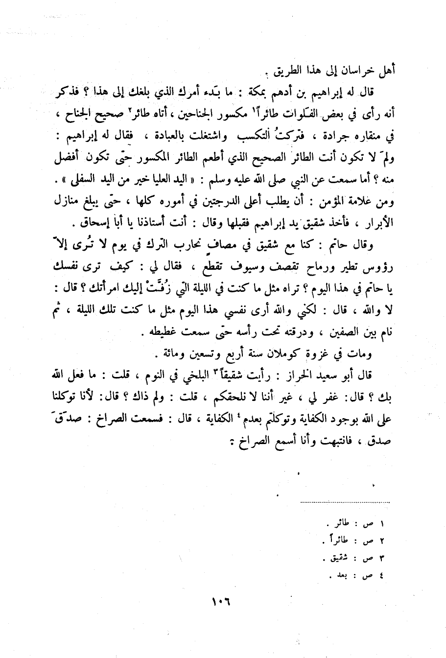 قال أبو سعيد الخراز: رأيت شقيقاً (3) البلخي في النوم، قلت: ما فعل الله بك؟ قال: غفر لي، غير أننا لا نلحقكم، قلت: ولم ذاك؟ قال: لأنا توكلنا على الله بوجود الكفاية وتوكلتم بعدم (4) الكفاية، قال: فسمعت الصراخ: صدق صدق، فانتبهت وأنا أسمع الصراخ.