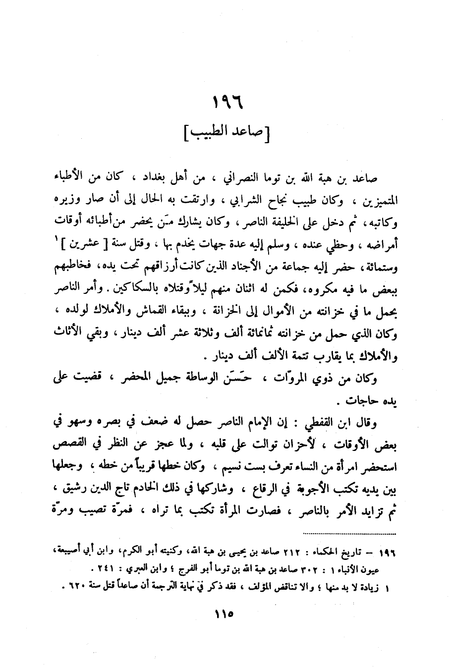 (1) تاريخ الحكماء: 212 صاعد بن يحيى بن هبة الله، وكنيته أبو الكرم، وابن أبي أصيبعة، عيون الأنباء 1: 302 صاعد بن هبة الله بن توما أبو الفرج؛ وابن العبري: 241.