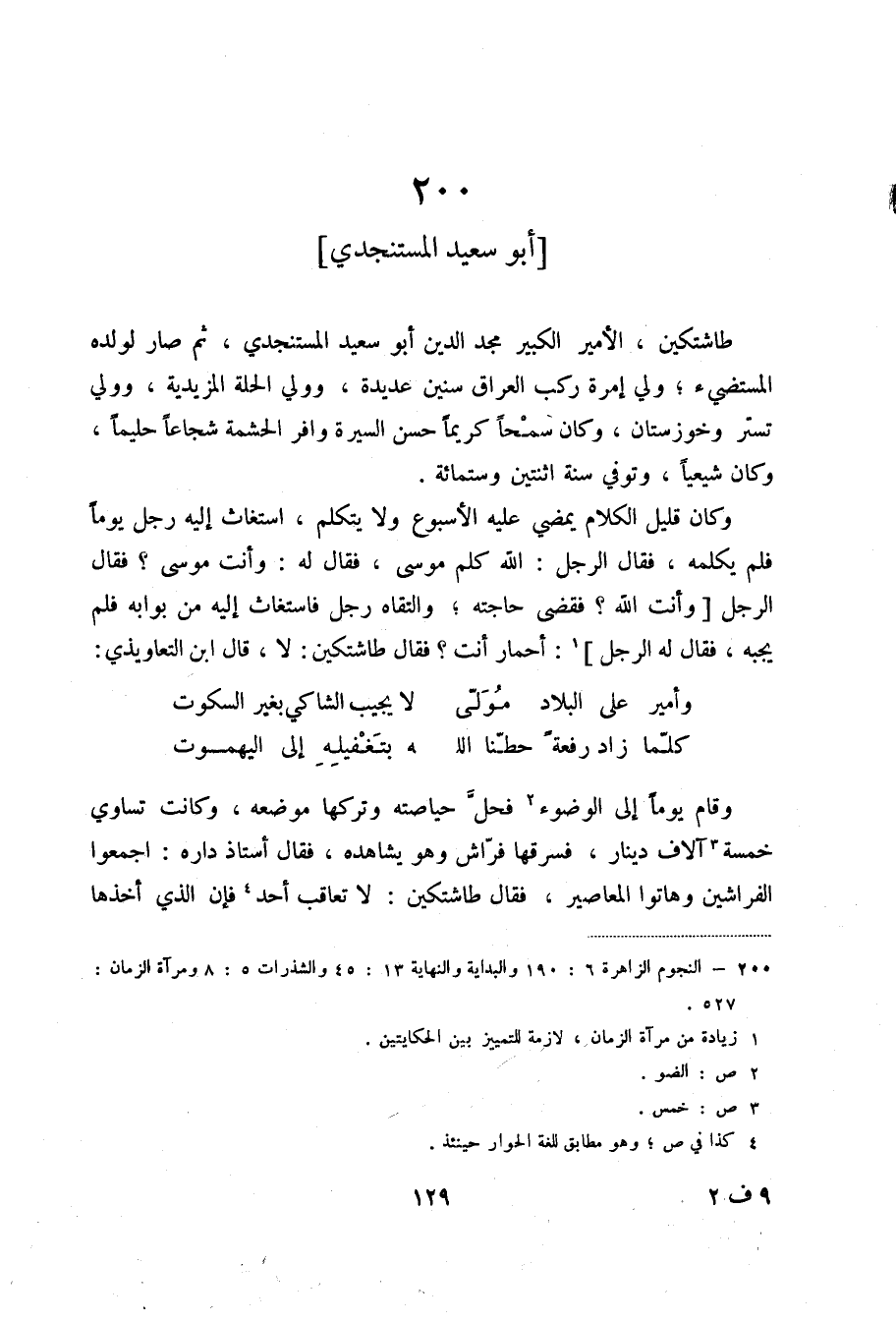 طاشتكين، الأمير الكبير مجد الدين أبو سعيد المستنجدي، ثم صار لولده المستضيء؛ ولي إمرة ركب العراق سنين عديدة، وولي الحلة المزيدية، وولي تستر وخوزستان، وكان سمحاً كريماً حسن السيرة وافر الحشمة شجاعاً حليماً، وكان شيعياً، وتوفي سنة اثنتين وستمائة.