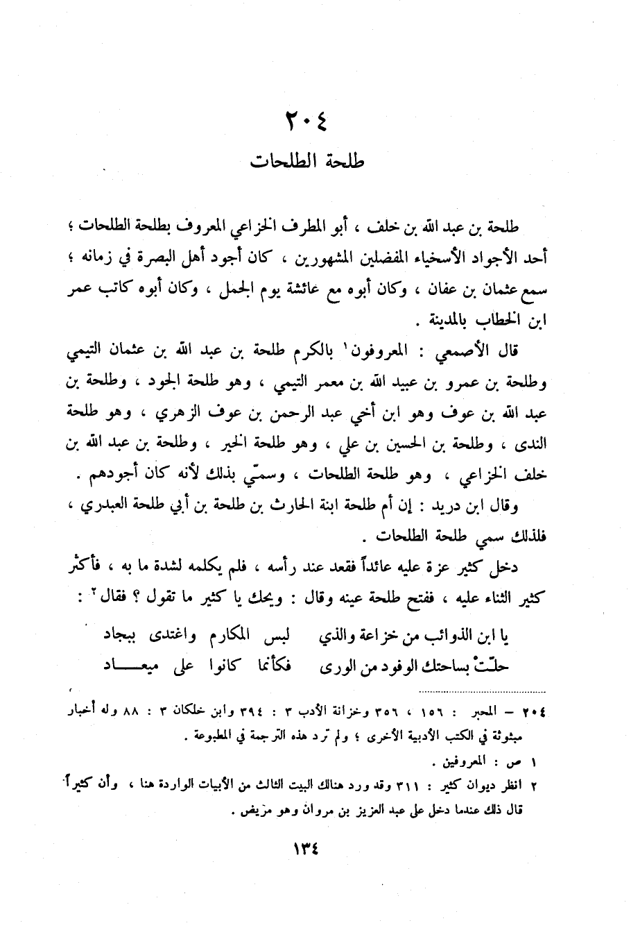 قال الأصمعي: المعرفون (2) بالكرم طلحة بن عبد الله بن عثمان التيمي وطلحة بن عمرو بن عبيد الله بن معمر التيمي، وهو طلحة الجود، وطلحة بن عبد الله بن عوف وهو ابن أخي عبد الرحمن بن عوف الزهري، وهو طلحة الندى، وطلحة بن الحسين بن علي، وهو طلحة الخير وطلحة بن عبيد الله بن خلف الخزاعي، وهو طلحة الطلحات، وسمي بذلك لأنه كان أجودهم.