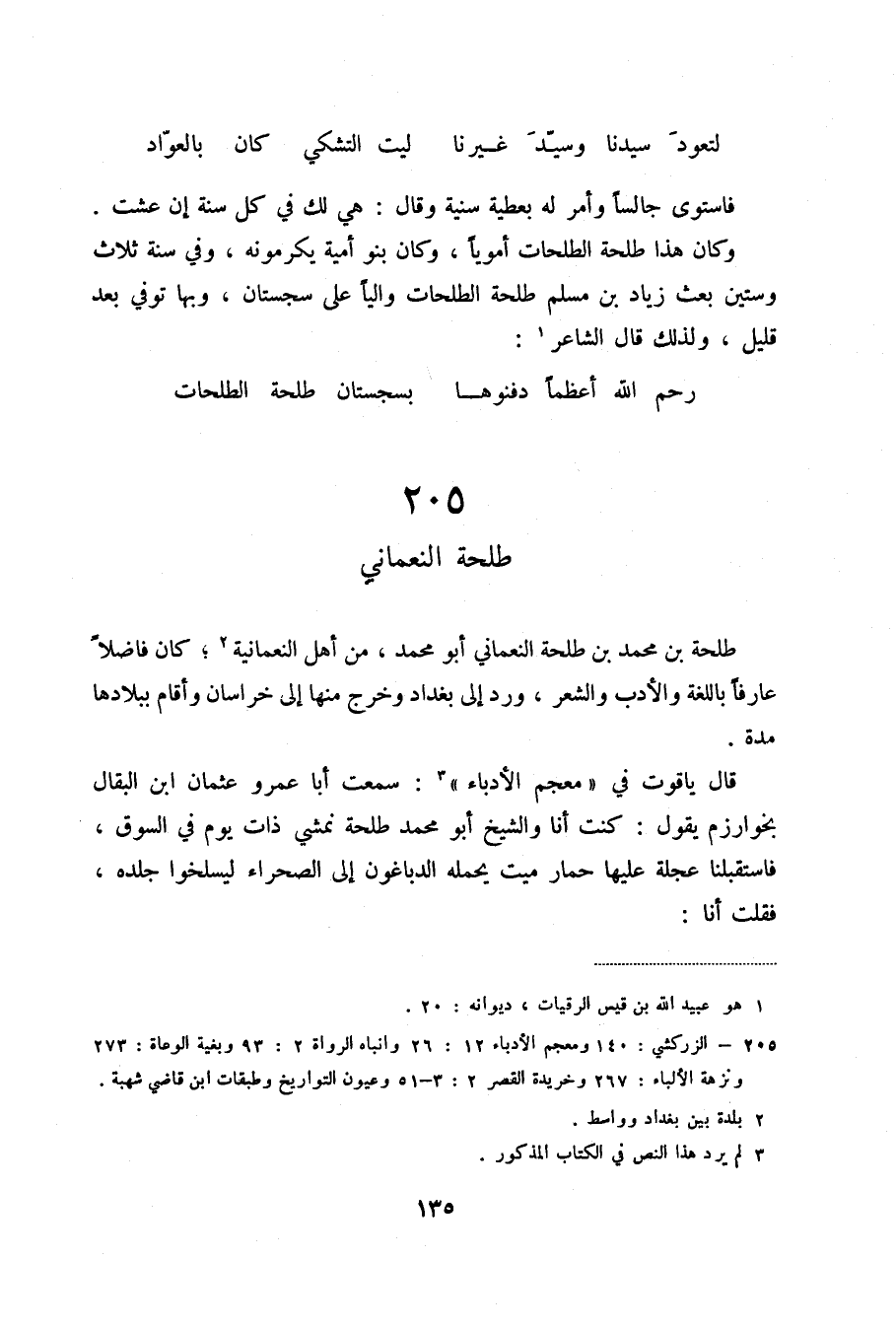 طلحة بن محمد بن طلحة النعماني أبو محمد، من أهل النعمانية (3) ؛ كان فاضلاً عارفاً باللغة والأدب والشعر، ورد إلى بغداد وخرج منها إلى خراسان وأقام ببلادها مدة.