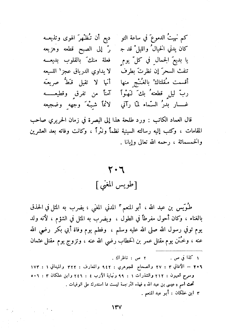طويس بن عبد الله، أبو المنعم (4) المدني المغني؛ يضرب به المثل في الحذق بالغناء، وكان أحول مفرطاً في الطول، ويضرب به المثل في الشؤم، لأنه ولد يوم توفي رسول الله صلى الله عليه وسلم، وفطم يوم وفاة أبي بكر رضي الله عنه، وختن يوم مقتل عمر بن الخطاب رضي الله عنه، وتزوج يوم مقتل عثمان