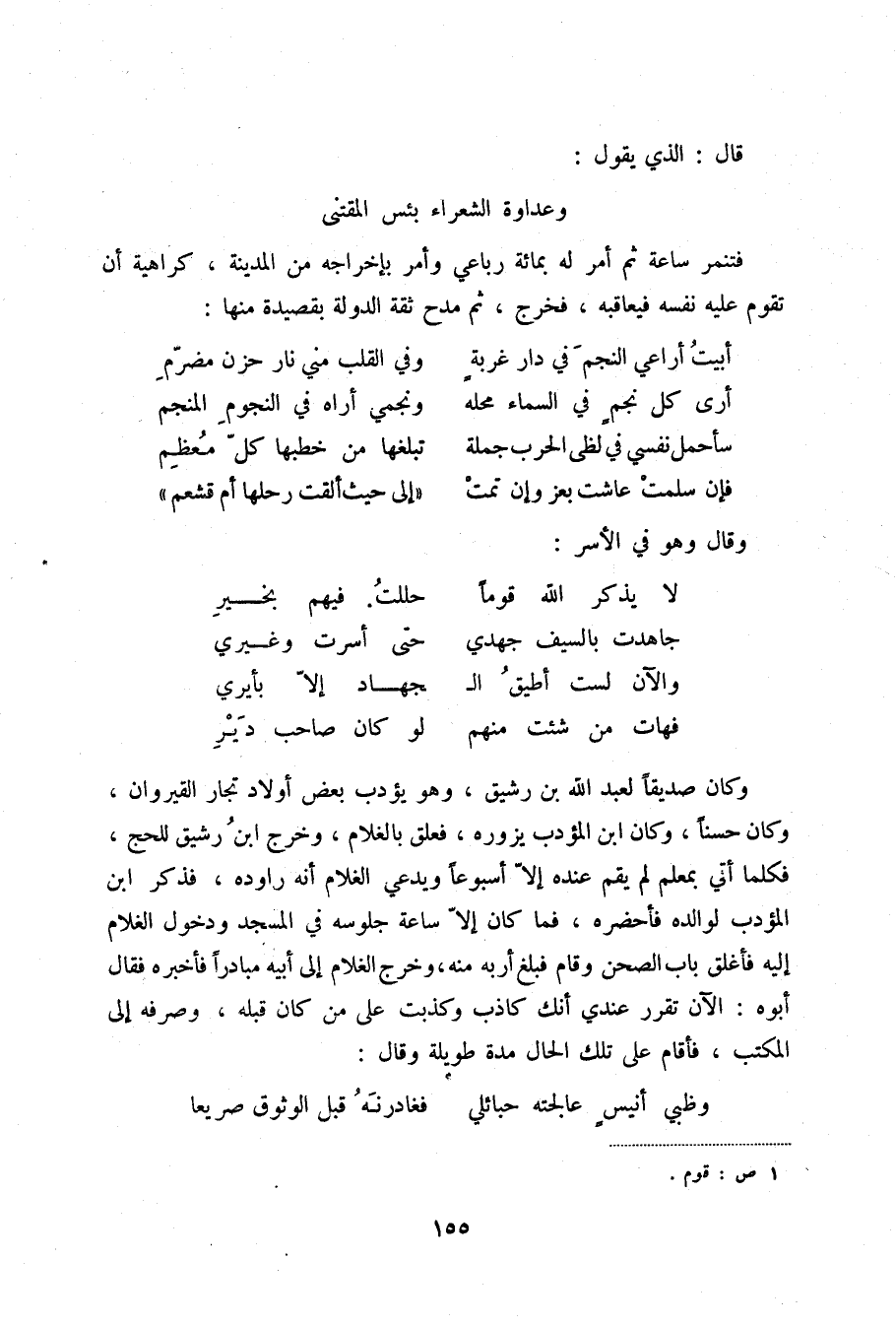 فهات من شئت منهم ... لو كان صاحب دير وكان صديقاً لعبد الله بن رشيق، وهو يؤدب بعض أولاد تجار القيروان، وكان حسناً، وكان ابن المؤدب يزوره، فعلق بالغلام، وخرج ابن رشيق للحج، فكلما أتي بمعلم لم يقم عنده إلا أسبوعاً ويدعي الغلام أنه راوده، فذكر ابن المؤدب لوالده فأحضره، فما كان إلا ساعة جلوسه في المسجد ودخول الغلام إليه فأغلق باب الصحن وقام فبلغ أربه منه، وخرج الغلام إلى أبيه مبادراً فأخبره فقال أبوه: الآن تقرر عندي أنك كاذب وكذبت على من كان قبله، وصرفه إلى المكتب، فأقام على تلك الحال مدة طويلة وقال: