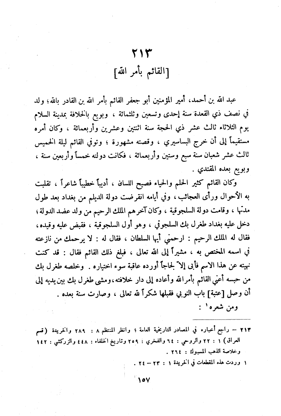 عبد الله بن أحمد، أمير المؤمنين أبو جعفر القائم بأمر الله بن القادر بالله؛ ولد في نصف ذي القعدة سنة إحدى وتسعين وثلثمائة، وبويع بالخلافة بمدينة السلام يوم الثلاثاء ثالث عشر ذي الحجة سنة اثنتين وعشرين وأربعمائة، وكان أمره مستقيماً إلى أن خرج البساسيري، وقصته مشهورة؛ وتوفي القائم ليلة الخميس ثالث عشر شعبان سنة سبع وستين وأربعمائة، فكانت دولته خمساً وأربعين سنة، وبويع بعده المقتدي.