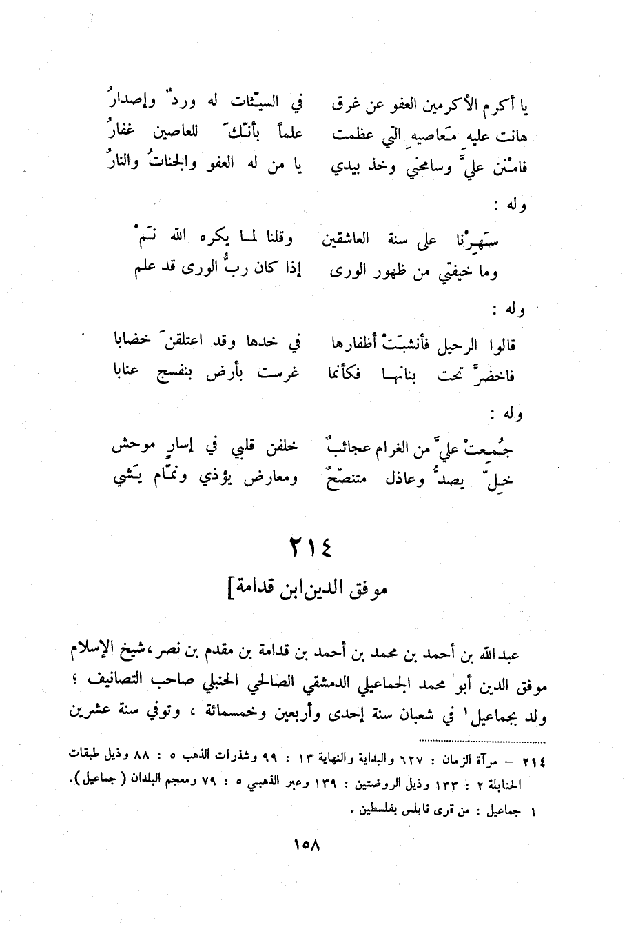 عبد الله بن أحمد بن محمد بن أحمد بن قدامة بن مقدم بن نصر، شيخ الإسلام موفق الدين أبو محمد الجماعيلي الدمشقي الصالحي الحنبلي صاحب التصانيف؛ ولد بجماعيل (2) في شعبان سنة إحدى وأربعين وخمسمائة، وتوفي سنة عشرين
