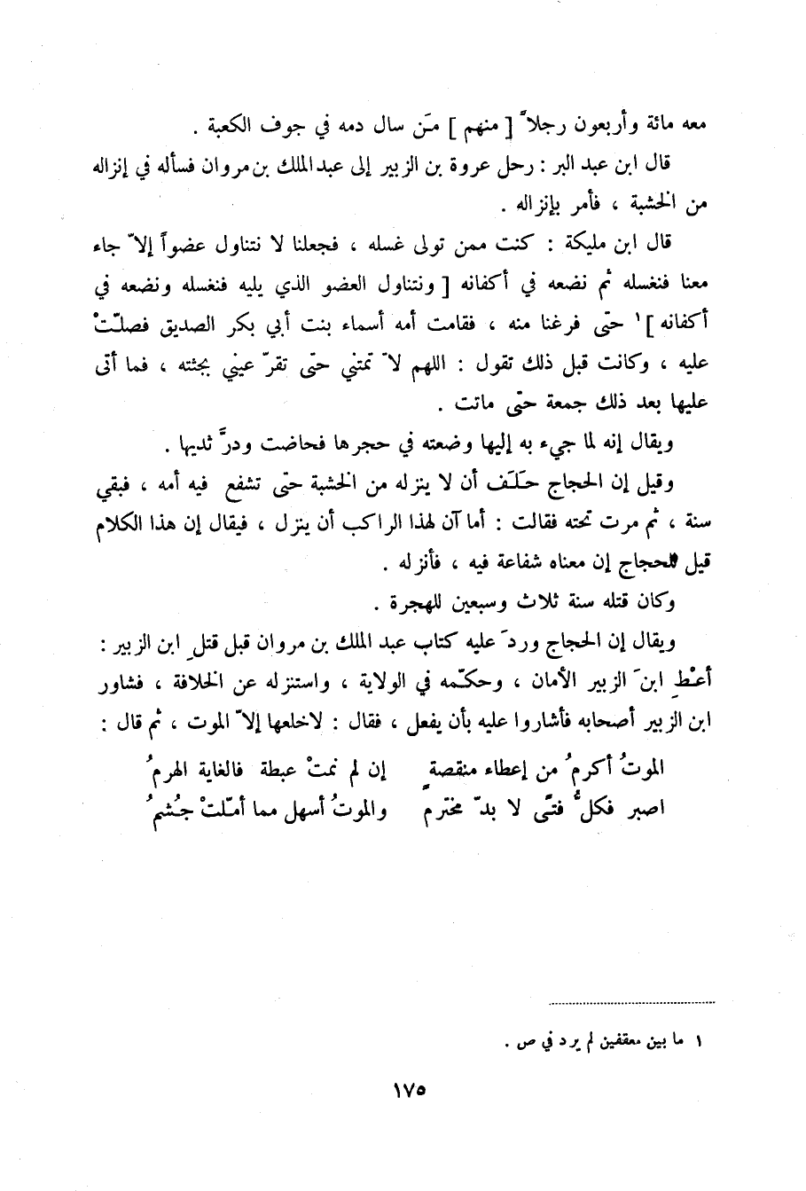 ويقال إن الحجاج ورد عليه كتاب عبد الملك بن مروان قبل قتل ابن الزبير: أعط ابن الزبير الأمان، وحكمه في الولاية، واستنزله عن الخلافة، فشاور ابن الزبير أصحابه فأشاروا عليه بأن يفعل، فقال: لا خلعها إلا الموت، ثم قال: