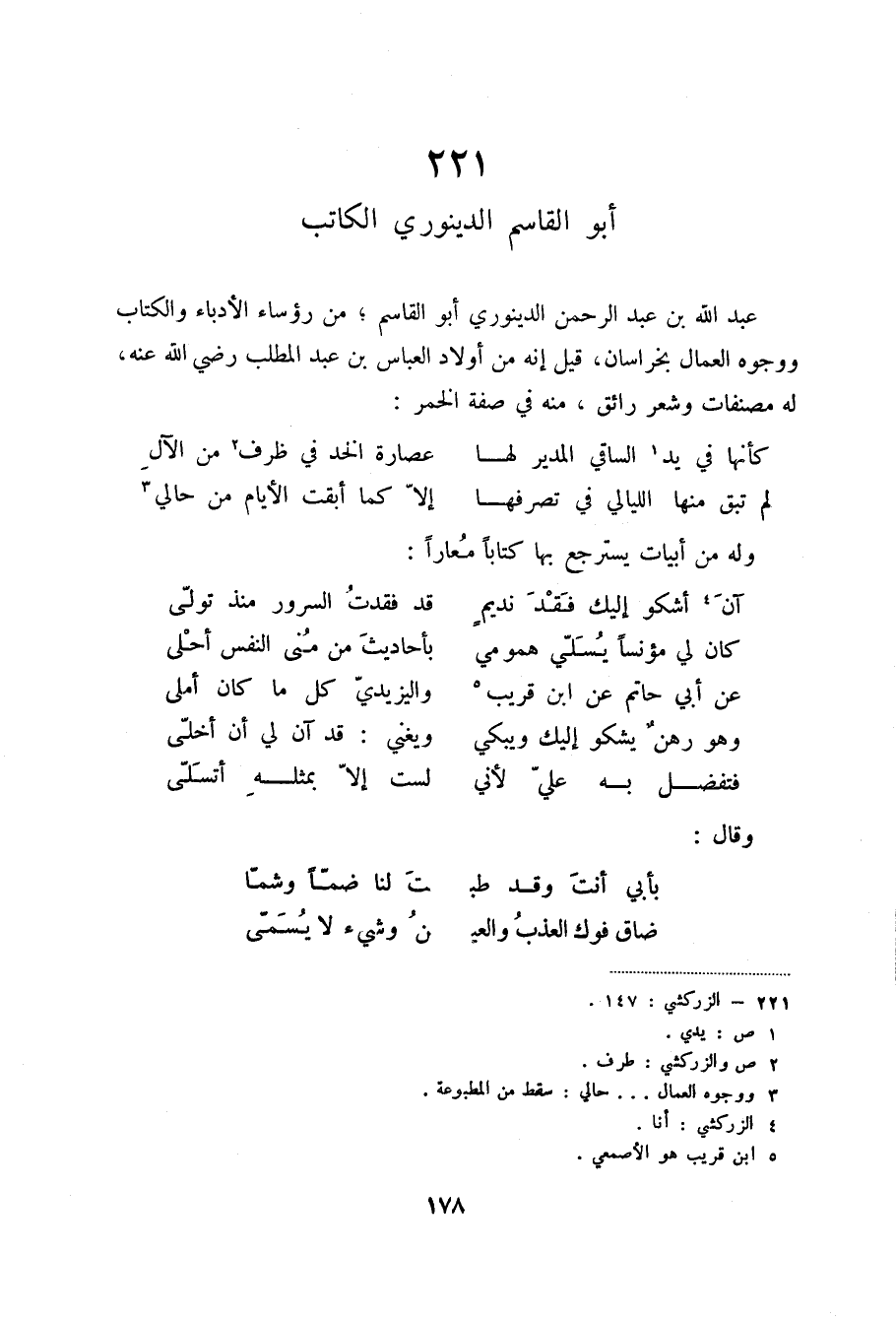 عبد الله بن عبد الرحمن الدينوري أبو القاسم؛ من رؤساء الأدباء والكتاب ووجوه العمال بخراسان، قيل إنه من أولاد العباس بن عبد المطلب رضي الله عنه، له مصنفات وشعر رائق، منه في صفة الخمر: