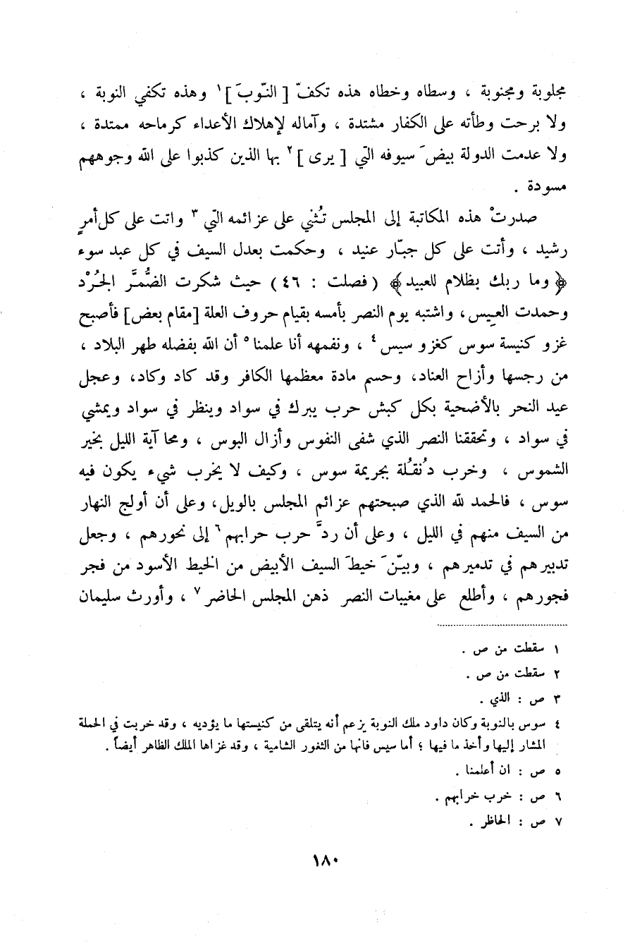 صدرت هذه المكاتبة إلى المجلس تثني على عزائمه التي (3) واتت على كل أمرٍ رشيد، واتت على كل جبار عنيد، وحكمت بعدل السيف في كل عبد سوء " وما ربك بظلام للعبيد " فصلت: حيث شكرت الضمر الجرد وحمدت العيس، واشتبه يوم النصر بأمسه بقيام حروف العلة مقام بعض فأصبح غزو كنيسة سوس كغزو سيس (4) ، ونفهمه أنا علمنا (5) أن الله بفضله طهر البلاد، من رجسها وأزاح العناد، وحسم مادة معظمها الكافر وقد كاد وكاد، وعجل عيد النحر بالأضحية بكل كبش حرب يبرك في سواد وينظر في سواد ويمشي في سواد، وتحققنا النصر الذي شفى النفوس وأزال البوس، ومحا آية الليل بخير الشموس، وخرب دنقلة بجريمة سوس، وكيف لا يخرب شيء يكون فيه سوس، فالحمد لله الذي صبحتهم عزائم المجلس بالويل، وعلى أن أولج النهار من السيف منهم في الليل، وعلى أن رد حرب حرابهم (6) إلى نحورهم، وجعل تدبيرهم في تدميرهم، وبين خيط السيف الأبيض من الخيط الأسود من فجر فجورهم، واطلع على مغيبات النصر ذهن المجلس الحاضر (7) ، وأورث سليمان