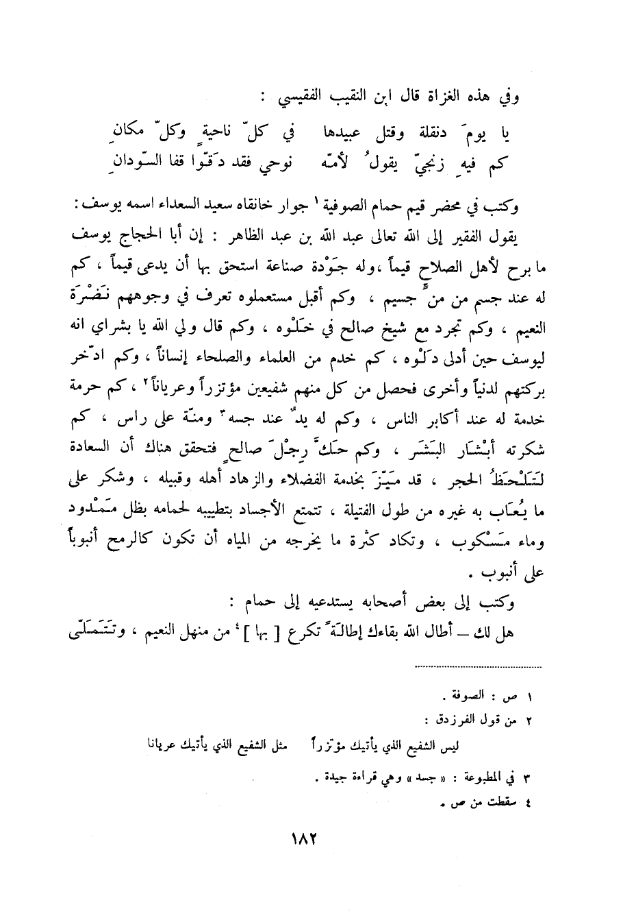 يقول الفقير إلى الله تعالى عبد الله بن عبد الظاهر: إن أبا الحجاج يوسف ما برح لأهل الصلاح قيماً، وله جودة صناعة استحق بها أن يدعي قيماً، كم له عند جسم من من جسيم، وكم أقبل مستعملوه تعرف في وجوههم نضرة النعيم، وكم تجرد مع شيخ صالح في خلوه، وكم قال ولي الله يا بشراي إنه ليوسف حين أدلى دلوه، كم خدم من العلماء والصلحاء إنساناً، وكم ادخر بركتهم لدنياً وأخرى فحصل من كل منهم شفيعين مؤتزراً وعرياناً (2) ، كم حرمة خدمة له عند أكابر الناس، وكم له يد عند جسه (3) ومنة على راس، كم شكرته أبشار البشر، وكم حك رجل صالحٍ فتحقق هناك أن السعادة لتلحظ الحجر، قد ميز بخدمة الفضلاء والزهاد أهله وقبيله، وشكر على ما يعاب به غيره من طول الفتيلة، تتمتع الأجساد بتطييبه لحمامه بظل ممدود وماء مسكوب، وتكاد كثرة ما يخرجه من المياه أن تكون كالرمح أنبوباً على أنبوب.