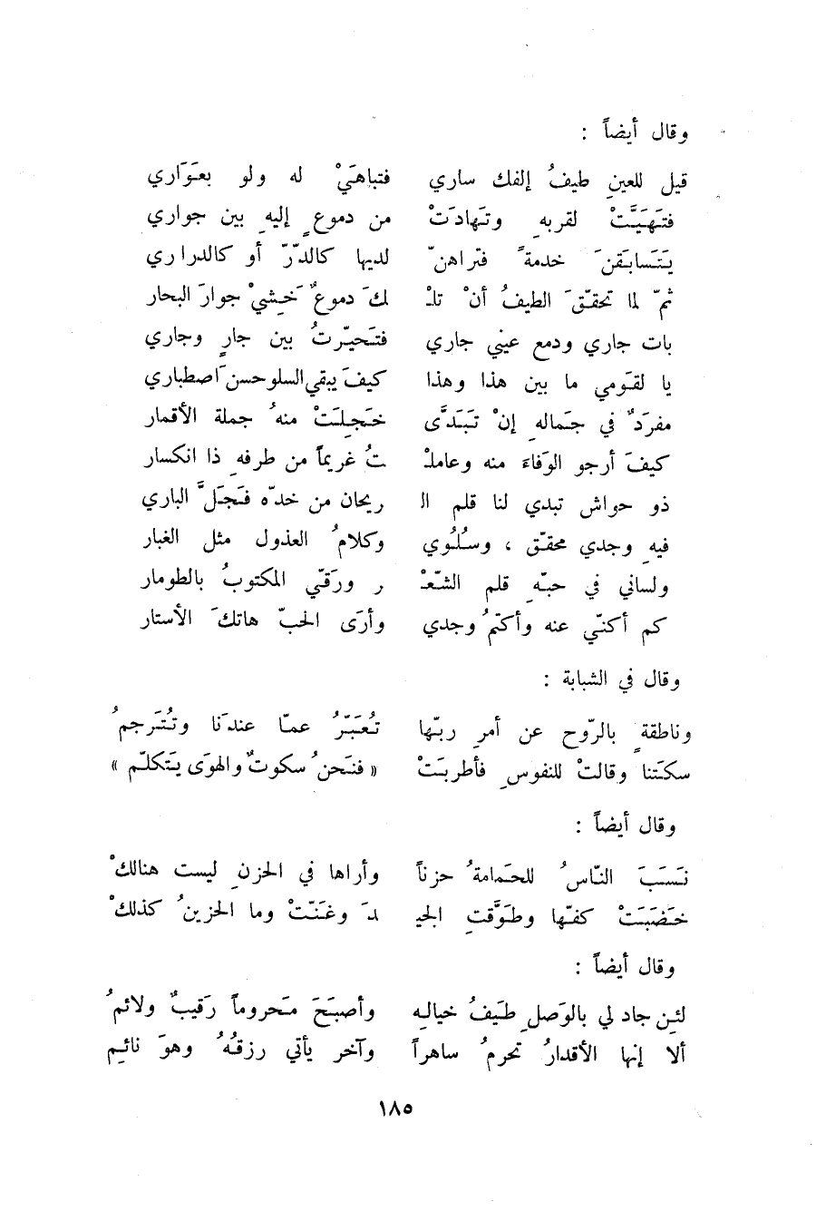 سكتنا وقالت للنفوس فأطربت ... فنحن سكوت والهوى يتكلم وقال أيضاً: