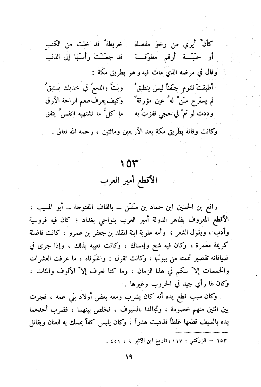 رافع بن حسين ابن حماد بن مقن - بالقاف المفتوحة - أبو المسيب، الأقطع المعروف بظاهر الدولة أمير العرب بنواحي بغداد؛ كان فيه فروسية وأدب، ويقول الشعر؛ وأمه علوية ابنة المقلد بن جعفر بن عمرو؛ كانت فاضلة كريمة معمرة، وكان فيه شح وإمساك، وكانت تعيبه بذلك، وإذا جرى في ضيافاته تقصير تممته من بيوتها، وكانت تقول: واغوثاه، ما عرفت العشرات والخمسات إلا منكم في هذا الزمان، وما كنا نعرف إلا الألوف والمئات، وكان لها رأي جيد في الحروب وغيرها.
