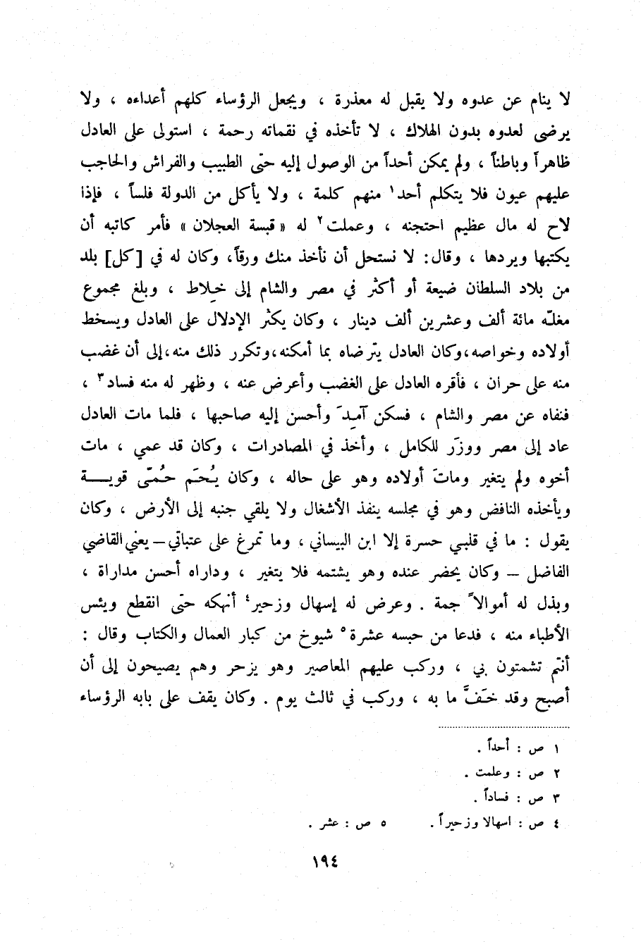 لا ينام عن عدوه ولا يقبل له معذرة، ويجعل الرؤساء كلهم أعداءه، ولا يرضى لعدوه بدون الهلاك، لا تأخذه في نقماته رحمة، استولى على العادل ظاهراً وباطناً، ولم يمكن أحداً من الوصول إليه حتى الطبيب والفراش والحاجب عليهم عيون فلا يتكلم أحد (1) منهم كلمة، ولا يأكل من الدولة فلساً، فإذا لاح له مال عظيم احتجنه، وعملت (2) له قبسة العجلان فأمر كاتبه أن يكتبها ويردها، وقال: لا نستحل أن نأخذ منك ورقاً، وكان له في كل بلد من بلاد السلطان ضيعة أو أكثر في مصر والشام إلى خلاط، وبلغ مجموع مغله مائة ألف وعشرين ألف دينار، وكان يكثر الإدلال على العادل ويسخط أولاده وخواصه، وكان العادل يترضاه بما أمكنه، وتكرر ذلك منه، إلى أن غضب منه على حران، فأقره العادل على الغضب وأعرض عنه، وظهر له منه فساد (3) ، فنفاه عن مصر والشام، فسكن آمد وأحسن إليه صاحبها، فلما مات العادل عاد إلى مصر ووزر للكامل، وأخذ في المصادر، وكان قد عمي، مات أخوه ولم يتغير ومات أولاده وهو على حاله، وكان يحم حمى قوية ويأخذه النافض وهو في مجلسه ينفذ الأشغال ولا يلقي جنبه إلى الأرض، وكان يقول: ما في قلبي حسرة إلا ابن البيساني، وما تمرغ على عتباتي - يعني القاضي الفاضل - وكان يحضر عنده وهو يشتمه فلا يتغير، وداراه أحسن مداراة، وبذل له أموالاً جمة. وعرض له إسهال وزحير (4) أنهكه حتى انقطع ويئس الأطباء منه، فدعا من حبسه عشرة (5) شيوخ من كبار العمال والكتاب وقال: أنتم تشمتون بي، وركب عليهم المعاصير وهو يزحر وهم يصيحون إلى أن أصبح وقد خف ما به، وركب في ثالث يوم. وكان يقف على بابه الرؤساء