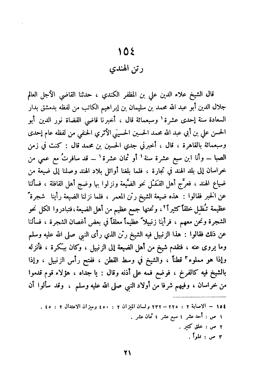 قال الشيخ علاء الدين علي بن المظفر الكندي، حدثنا القاضي الأجل العالم جلال الدين أبو عبد الله محمد بن سليمان بن إبراهيم الكاتب من لفظه بدمشق بدار السعادة سنة إحدى عشرة وسبعمائة قال: أخبرنا قاضي القضاة نور الدين أبو الحسن علي بن أبي عبد الله محمد الحسين الحسيني الأثري الحنفي من لفظه عام إحدى وسبعمائة بالقاهرة، قال: أخبرني جدي الحسين بن محمد قال: كنت في زمن الصبا - وأنا ابن سبع عشرة سنة (2) أو ثمان عشرة - قد سافرت مع عمي من خراسان إلى بلد الهند في تجارة، فلما بلغنا أوائل بلاد الهند وصلنا إلى ضيعة من ضياع الهند، فعرج أهل القفل نحو الضيعة ونزلوا بها وضج أهل القافلة، فسألنا عن الخبر فقالوا: هذه ضيعة الشيخ رتن المعمر، فلما نزلنا الضيعة رأينا شجرةً عظيمة تظل خلقاً كثيراً (3) ، وتحتها جمع عظيم من أهل الضيعة، فتبادروا الكل نحو الشجرة ونحن معهم، فرأينا زنبيلاً عظيماً معلقاً في بعض أغصان الشجرة، فسألنا عن ذلك فقالوا: هذا الزنبيل فيه الشيخ رتن الذي رأى النبي صلى الله عليه وسلم وما يروى عنه، فتقدم شيخ من أهل الضيعة إلى الزنبيل، وكان ببكرة، فأنزله وإذا هو مملوء (4) قطناً، والشيخ في وسط القطن، ففتح رأس الزنبيل، وإذا بالشيخ فيه كالفرخ، فوضع فمه على أذنه وقال: يا جداه، هؤلاء قوم قدموا من خراسان، وفيهم شرفاً من أولاد النبي صلى الله عليه وسلم، وقد سألوا أن