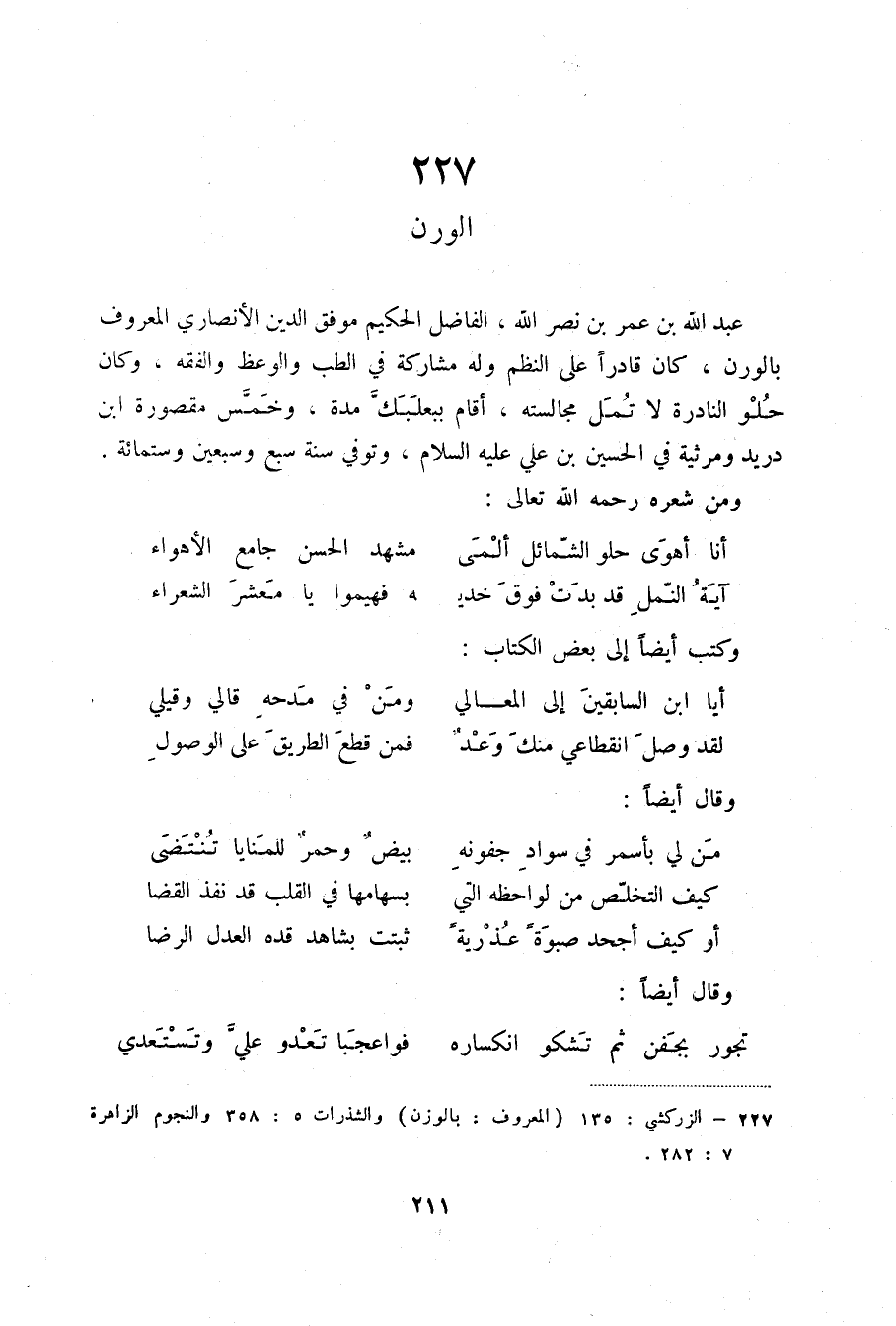 عبد الله بن عمر بن نصر الله، الفاضل الحكيم موفق الدين الأنصاري المعروف بالورن، كان قادراً على النظم وله مشاركة في الطب والوعظ والفقه، وكان حلو النادرة لا تمل مجالسته، أقام ببعلبك مدة، وخمس مقصورة ابن دريد ومرثية في الحسين بن علي عليه السلام، وتوفي سنة سبع وسبعين وستمائة. ومن شعره رحمه الله تعالى: