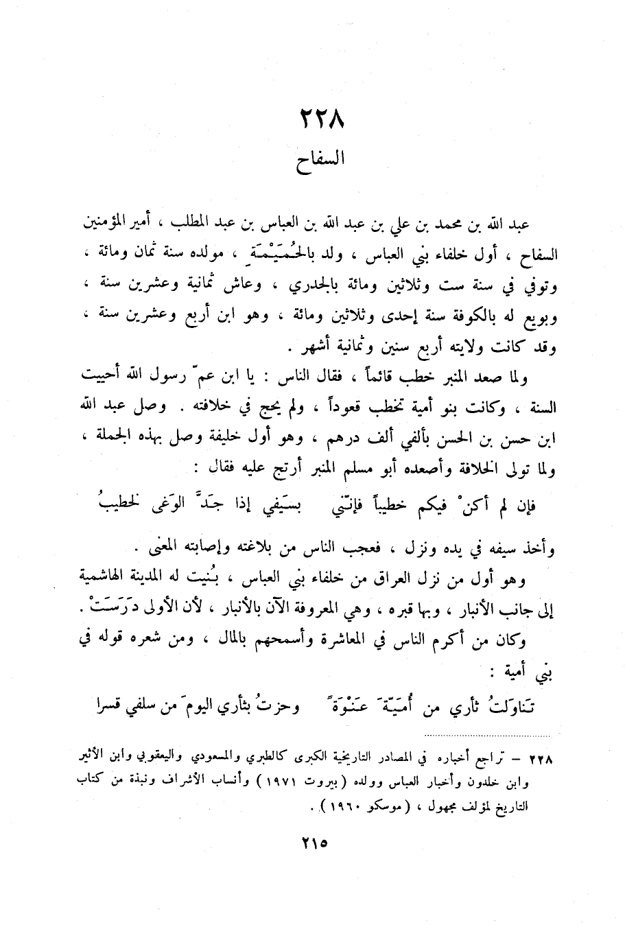 عبد الله بن محمد بن علي بن عبد الله بن العباس بن عبد المطلب، أمير المؤمنين السفاح، أول خلفاء بني العباس، ولد بالحميمة، مولده سنة ثمان ومائة، وتوفي في سنة ست وثلاثين ومائة بالجدري، وعاش ثمانية وعشرين سنة وبويع له بالكوفة سنة إحدى وثلاثين ومائة، وهو ابن أربع وعشرين سنة، وقد كانت ولايته أربع سنين وثمانية أشهر.