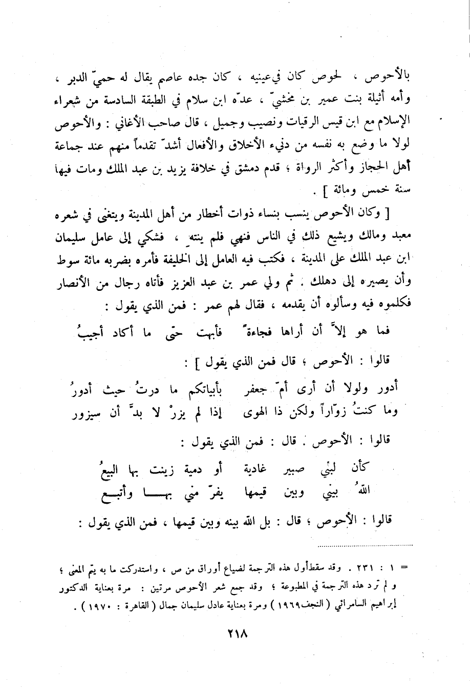 بالأحوص، لحوص كان في عينيه، كان جده عاصم يقال له حمي الدبر، وأمه أثيلة بنت عمير بن مخشي، عده ابن سلام في الطبقة السادسة من شعراء الإسلام مع ابن قيس الرقيات ونصيب وجميل، قال صاحب الأغاني: والأحوص لولا ما وضع به نفسه من دنيء الأخلاق والأفعال أشد تقدماً منهم عند جماعة أهل الحجاز وأكثر الرواة؛ قدم دمشق في خلافة يزيد بن عبد الملك ومات فيها سنة خمس ومائة.