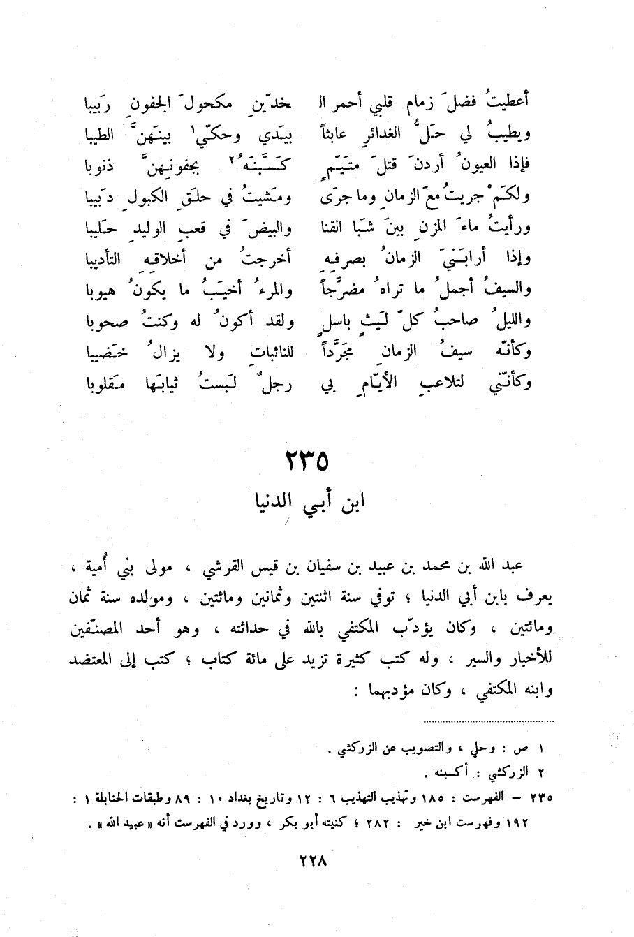 عبد الله بن محمد بن عبيد بن سفيان بن قيس القرشي، مولى بني أمية، يعرف بابن أبي الدنيا؛ توفي سنة اثنتين وثمانين ومائتين، ومولده سنة ثمان ومائتين، وكان يؤدب المكتفي بالله في حداثته، وهو أحد المصنفين للأخبار والسير، وله كتب كثيرة تزيد على مائة كتاب؛ كتب إلى المعتضد وابنه المكتفي، وكان مؤدبهما: