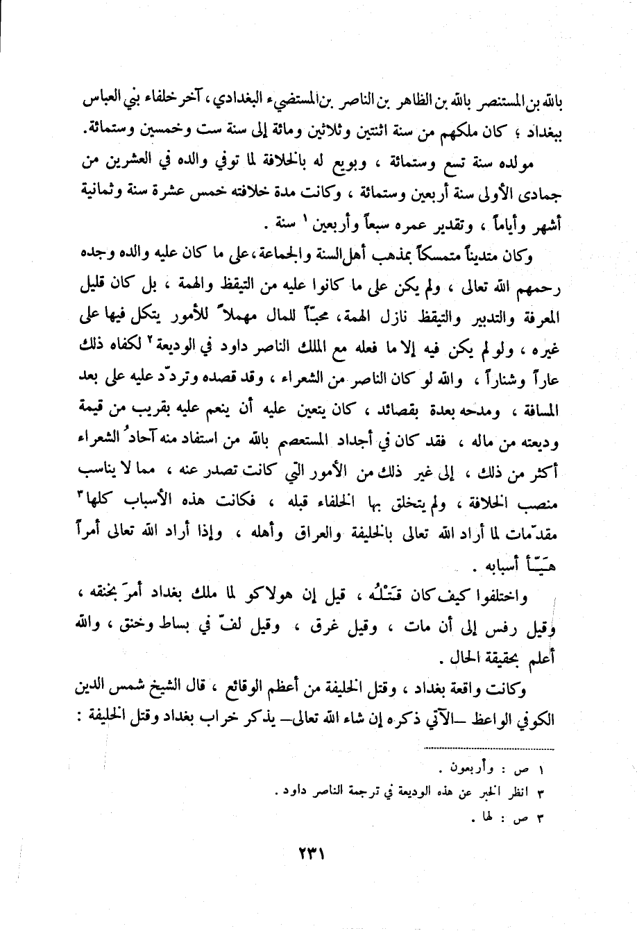 وكان متديناً متمسكاً بمذهب أهل السنة والجماعة، على ما كان عليه والده وجده رحمهم الله تعالى، ولم يكن على ما كانوا عليه من التيقظ والهمة، بل كان قليل المعرفة والتدبير والتيقظ نازل الهمة، محباً للمال مهملاً للأمور يتكل فيها على غيره، ولو لم يكن فيه إلا ما فعله مع الملك الناصر داود في الوديعة (2) لكفاه ذلك عاراً وشناراً، والله لو كان الناصر من الشعراء، وقد قصده وتردد عليه على بعد المسافة، ومدحه بعدة قصائد، كان يتعين عليه أن ينعم عليه بقريب من قيمة وديعته من ماله، فقد كان في أجداد المستعصم بالله من استفاد منه آحاد الشعراء أكثر من ذلك، إلى غير ذلك من الأمور التي كانت تصدر عنه، مما لا يناسب منصب الخلافة، ولم يتخلق بها الخلفاء قبله، فكانت هذه الأسباب كلها (3) مقدمات لما أراد الله تعالى بالخليفة والعراق وأهله، وإذا أراد الله تعالى أمراً هيأ أسبابه.