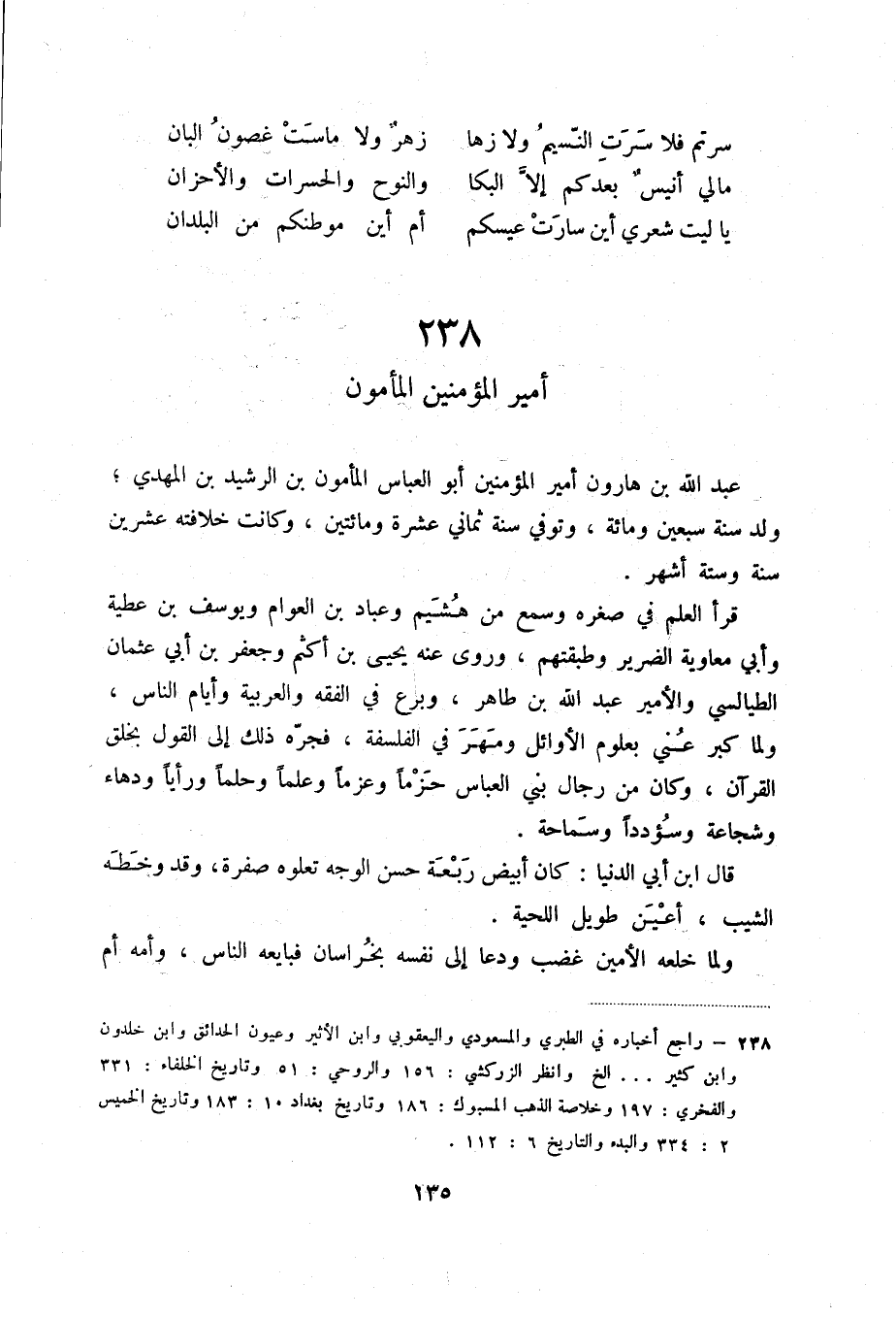 (1) راجع أخباره في الطبري والمسعودي واليعقوبي وابن الأثير وعيون الحدائق وابن خلدون وابن كثير ... الخ وانظر الزركشي: 156 والروحي: 51 وتاريخ الخلفاء: 231 والفخري: 197 وخلاصة الذهب المسبوك: 186 وتاريخ بغداد 10: 183 وتاريخ الخميس 2: 334 والبدء والتاريخ 6: 112.
