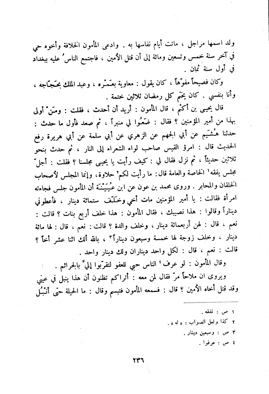 قال يحيى بن أكثم، قال المأمون: أريد أن أحدث، فقلت: ومن أولى بهذا من أمير المؤمنين؟ فقال: ضعوا لي منبراً، ثم صعد فأول ما حدث: حدثنا هشيم عن أبي الجهم عن الزهري عن أبي سلمة عن أبي هريرة رفع الحديث قال: امرؤ القيس صاحب لواء الشعراء إلى النار، ثم حدث بنحو ثلاثين حديثاً، ثم نزل فقال لي: كيف رأيت يا يحيى مجلسنا؟ فقلت: أجل مجلس يفقه (1) الخاصة والعامة قال: ما رأيت لكم (2) حلاوة، وإنما المجلس لأصحاب الخلقان والمحابر. وروى محمد بن عون عن ابن عيينة أن المأمون جلس فجاءته امرأة فقالت: يا أمير المؤمنين مات أخي وخلف ستمائة دينار، فأعطوني ديناراً وقالوا: هذا نصيبك، فقال المأمون: هذا خلف أربع بنات؟ قالت نعم، قال: لهن أربعمائة دينار، وخلف والدة؟ قالت: نعم، قال: لها مائة دينار، وخلف زوجة لها خمسة وسبعون ديناراً (3) ، بالله ألك اثنا عشر أخاً؟ قالت: نعم، قال: لكل واحد ديناران ولك دينار واحد.