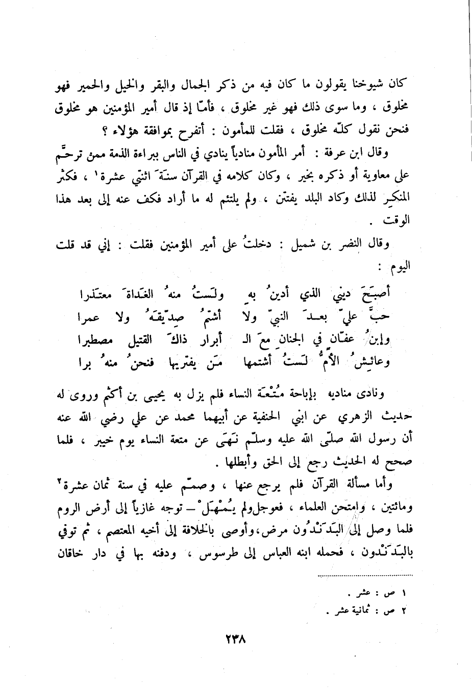 وقال ابن عرفة: أمر المأمون منادياً ينادي في الناس ببراءة الذمة ممن ترحم على معاوية أو ذكره بخير، وكان كلامه في القرآن سنة اثنتي عشرة (1) ، فكثر المنكر لذلك وكاد البلد يفتتن، ولم يلتئم له ما أراد فكف عنه إلى بعد هذا الوقت.