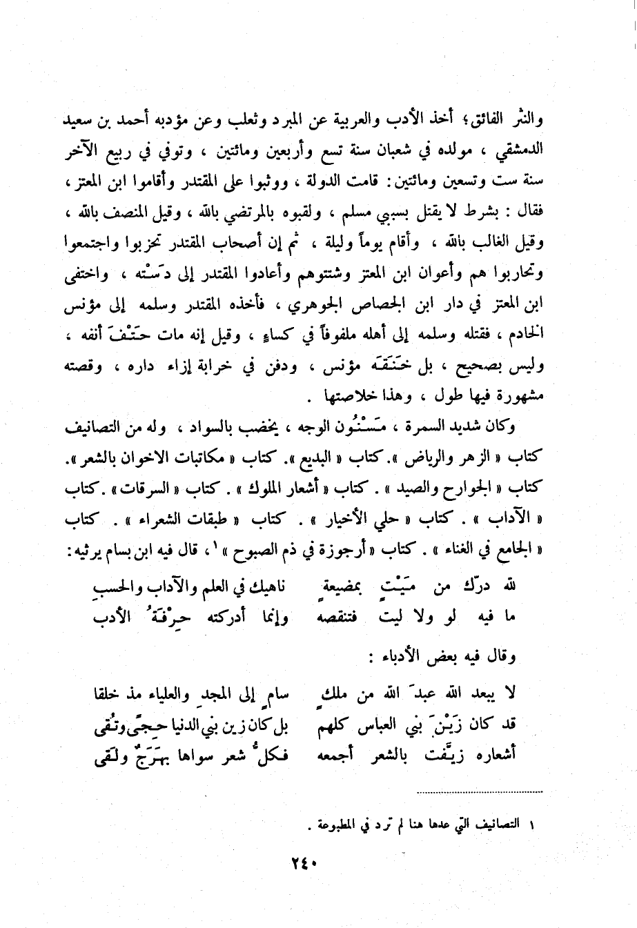 والنثر الفائق؛ أخذ الأدب والعربية عن المبرد وثعلب وعن مؤدبه أحمد بن سعيد الدمشقي، مولده في شعبان سنة تسع وأربعين ومائتين، وتوفي في ربيع الآخر سنة ست وتسعين ومائتين: قامت الدولة، ووثبوا على المقتدر وأقاموا ابن المعتز، فقال: بشرط لا يقتل بسببي مسلم، ولقبوه بالمرتضي بالله، وقيل المنصف بالله، وقيا الغالب بالله، وأقام يوماً وليلة، ثم إن أصحاب المقتدر تخربوا واجتمعوا وتحاربوا هم وأعوان ابن المعتز وشتتوهم وأعادوا المقتدر إلى دسته، واختفى ابن المعتز في دار ابن الجصاص الجوهري، فأخذه المقتدر وسلمه إلى مؤنس الخادم، فقتله وسلمه إلى أهله ملفوفاً في كساءٍ، وقيل إنه مات حتف أنفه، وليس بصحيح، بل خنقه مؤنس، ودفن في خرابة إزاء داره، وقصته مشهورة فيها طول، وهذا خلاصتها.