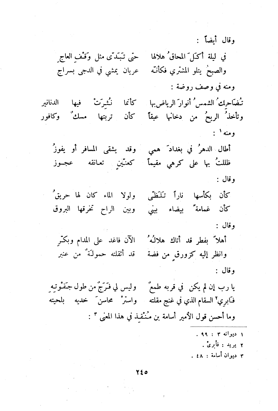فابري (2) السقام الذي في غنج مقلته ... واستر محاسن خديه بلحيته وما أحسن قول الأمير أسامة بن منقذ في هذا المعنى (3) :