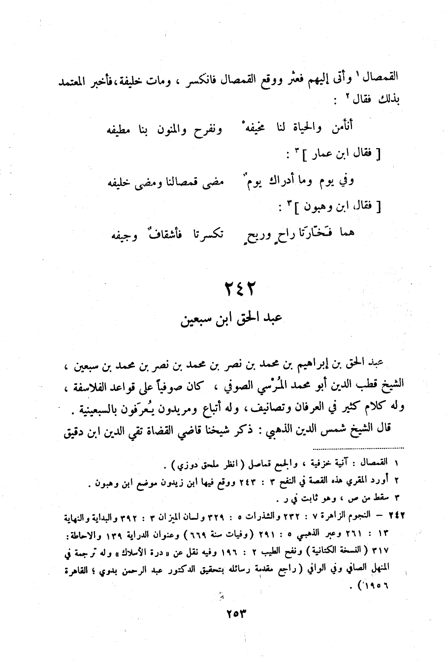 (4) النجوم الزاهرة 7: 232 والشذرات 5: 329 ولسان الميزان 3: 392 والبداية والنهاية 13: 261 وعبر الذهبي 5: 291 (وفيات سنة 669) وعنوان الدراية 139 والإحاطة: 317 (النسخة الكتانية) ونفح الطيب 2: 196 وفيه نقل عن ((درة الأسلاك)) وله ترجمة في المنهل الصافي وفي الوافي (راجع مقدمة رسائله بتحقيق الدكتور عبد الرحمن بدوي؛ القاهرة 1956) .