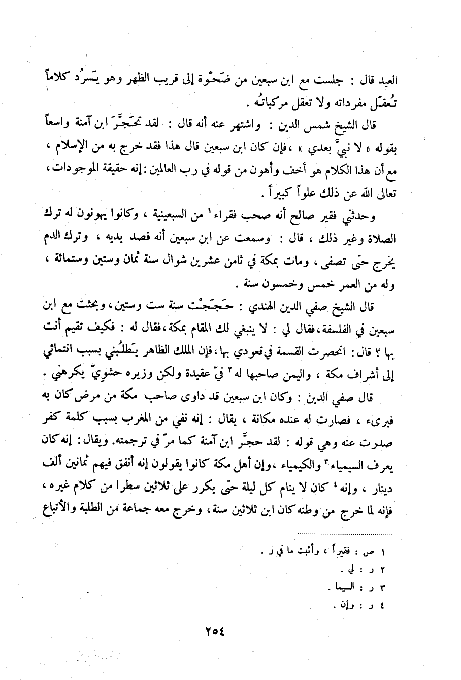 قال صفي الدين: وكان ابن سبعين قد داوى صاحب مكة من مرض كان به فبرىء، فصارت له عنده مكانة، يقال: إنه نفي من المغرب بسبب كلمة كفر صدرت عنه وهي قوله: لقد حجر ابن آمنة كما مر في ترجمته. ويقال: إنه كان يعرف السيمياء (3) والكيمياء، وإن أهل مكة كانوا يقولون إنه أنفق فيهم ثمانين ألف دينار، وإنه (4) كان لا ينام كل ليلة حتى يكرر على ثلاثين سطراً من كلام غيره، فإنه لما خرج من وطنه كان ابن ثلاثين سنة، وخرج معه جماعة من الطلبة والأتباع