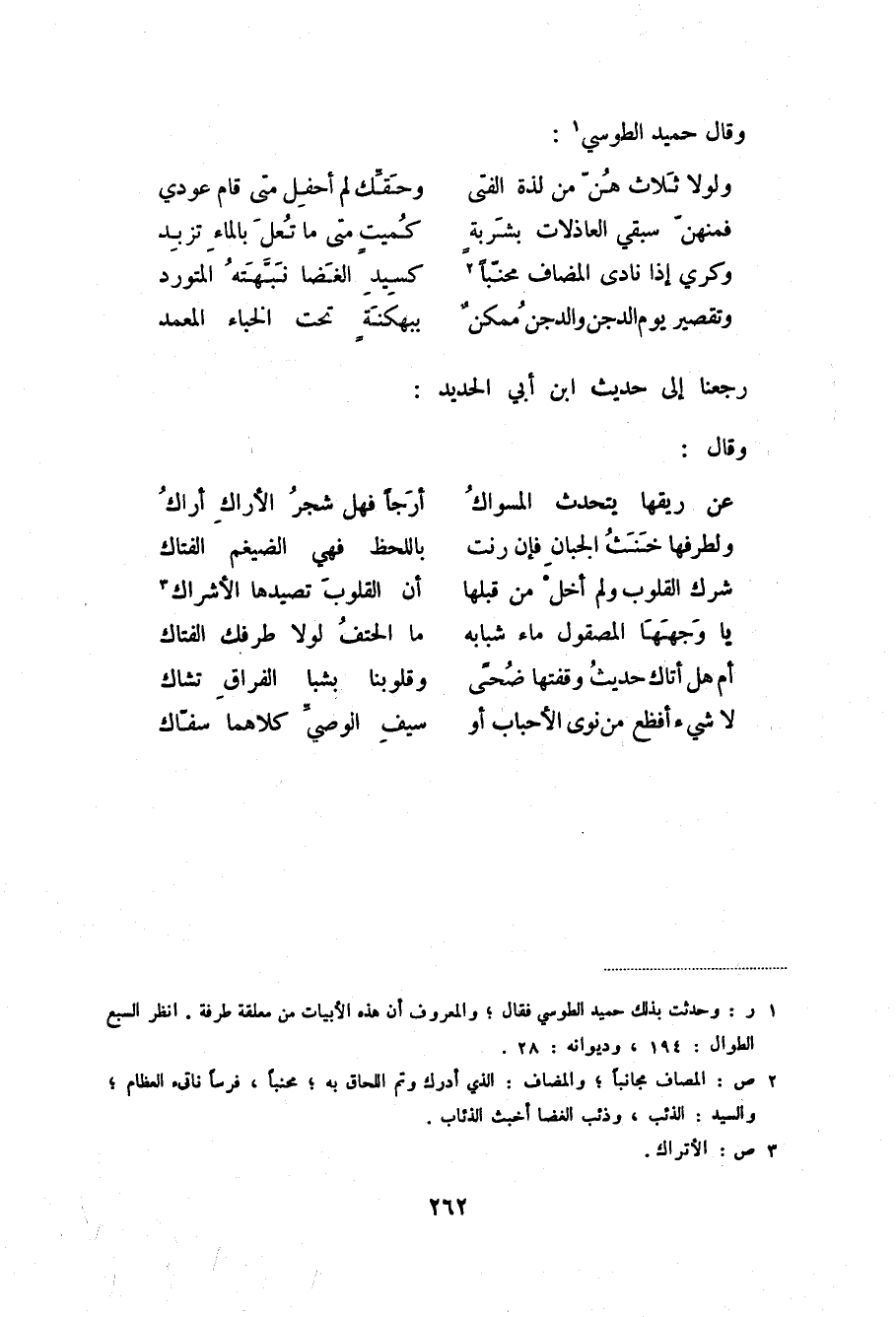 (1) ر: وحدثت بذلك حميد الطوسي فقال؛ والمعروف أن هذه الأبيات من معلقة طرفة. انظر السبع الطوال: 194، وديوانه: 28.
