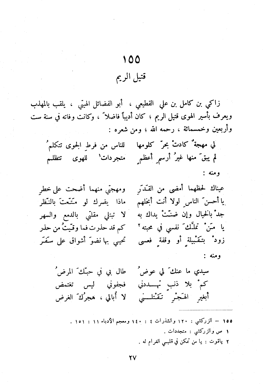 زاكي بن كامل بن علي القطيعي، أبو الفضائل الهيتي، يلقب بالمهذب ويعرف بأسير الهوى قتيل الريم؛ كان أديباً فاضلاً، وكانت وفاته في سنة ست وأربعين وخمسمائة، رحمه الله ومن شعره: