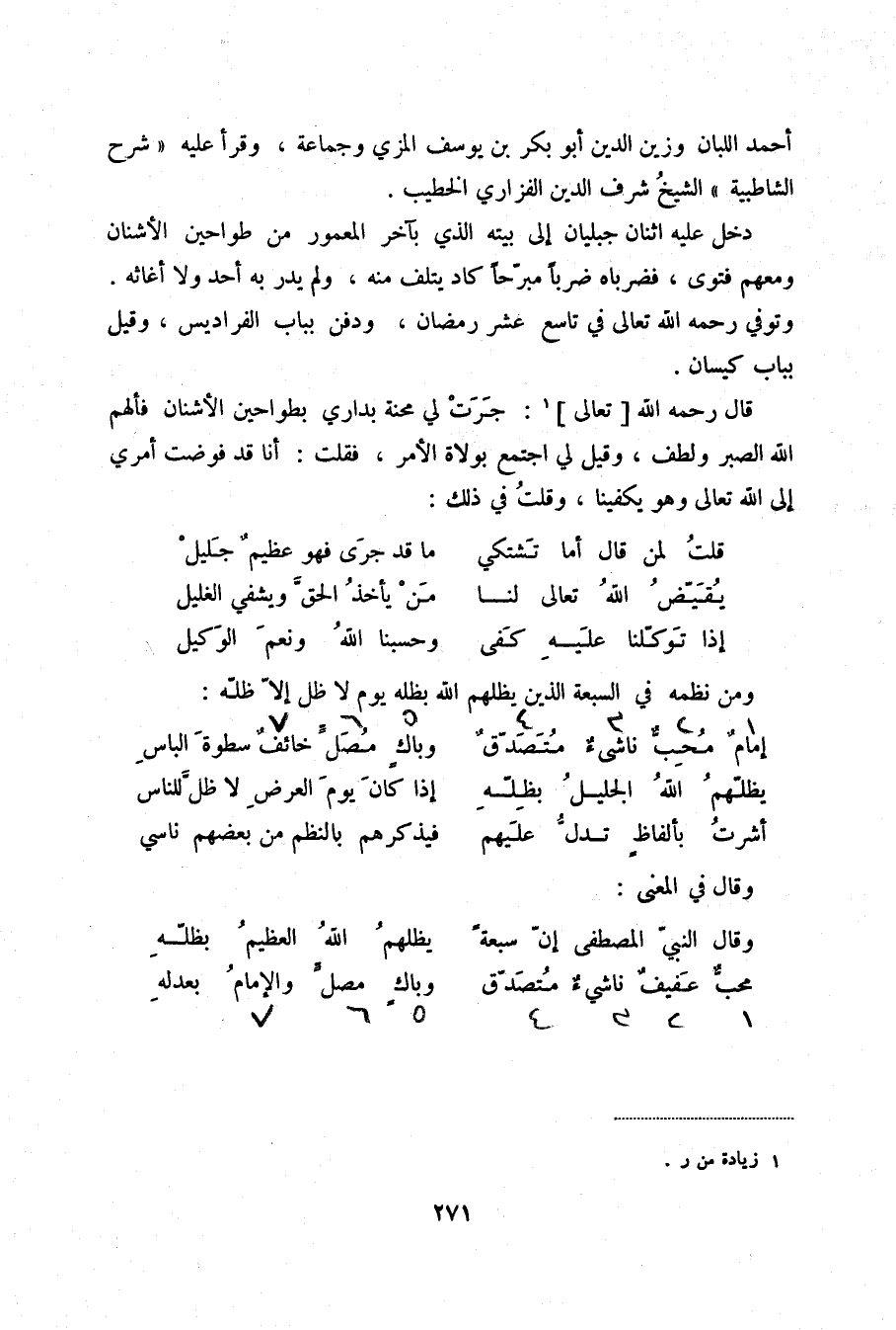 قال رحمه الله تعالى (1) : جرت لي محنة بداري بطواحين الأشنان فألهم الله الصبر ولطف، وقيل لي اجتمع بولاة الأمر، فقلت: أنا قد فوضت أمري إلى الله تعالى وهو يكفينا، وقلت في ذلك: