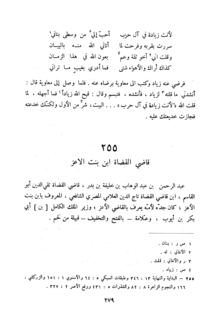 كذاك أراك والأهواء شتى ... فما أدري بغيبٍ ما تراني فرضي عنه زياد وكتب إلى معاوية برضاه عنه. فلما وصل إلى معاوية قال: أنشدني ما قلته (3) لزياد، فأنشده، فتبسم وقال: قبح الله زياداً (4) فما أجهله، لما قلت الله لأنت زيادة في آل حرب ... البيت، شر من الأول ولكنك خدعته فجازت خديعتك عليه.