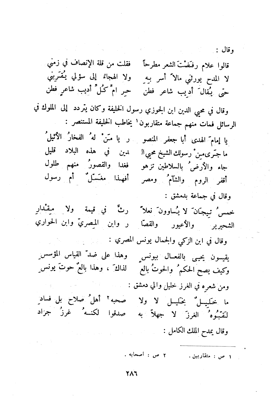 حتى يقال أديب شاعر فطن ... حرام كل أديب شاعرٍ فطن وقال محيي الدين ابن الجوزي رسول الخليفة وكان يتردد إلى الملوك في الرسائل فمات منهم جماعة متقاربون (1) يخاطب الخليفة المستنصر: