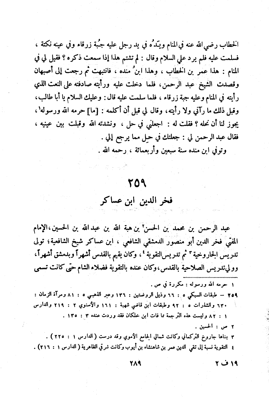 الخطاب رضي الله عنه في المنام ويده في يد رجل عليه جبة زرقاء وفي عينه نكتة، فسلمت عليه فلم يرد علي السلام وقال: لم تشتم هذا إذا سمعت ذكره؟ فقيل لي في المنام: هذا عمر بن الخطاب، وهذا ابن منده، فانتبهت ثم رجعت إلى أصبهان وقصدت الشيخ عبد الرحمن، فلما دخلت عليه ورأيته صادفته على النعت الذي رأيته في المنام وعليه جبة زرقاء، فلما سلمت عليه قال: وعليك السلام يا أبا طالب، وقبل ذلك ما رآني ولا رأيته، وقال لي قبل أن أكلمه: ما حرمه الله ورسوله (1) ، يجوز لنا أن نحله؟ فقلت له: اجعلني في حل، ونشدته الله وقبلت بين عينيه، فقال عبد الرحمن لي: جعلتك في حل مما يرجع إلي.