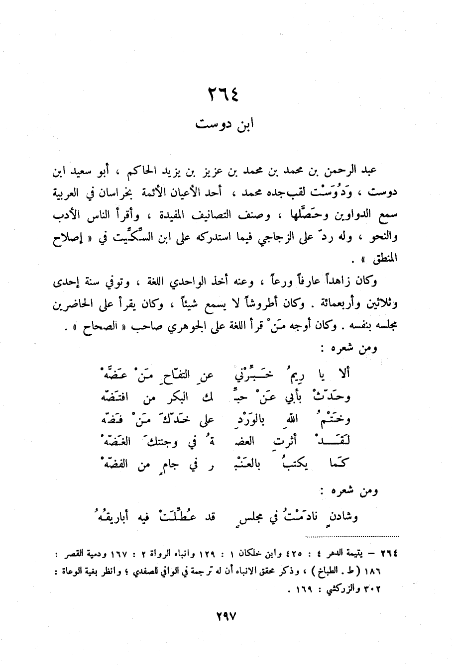 (1) يتيمة الدهر 4: 425 وابن خلكان 1: 129 وانباه الرواة 2: 167 ودمية القصر: 186 (ط. الطباخ) ، وذكر محقق الانباه أن له ترجمة في الوافي للصفدي؛ وانظر بغية الوعاة: 302 والزركشي: 169.