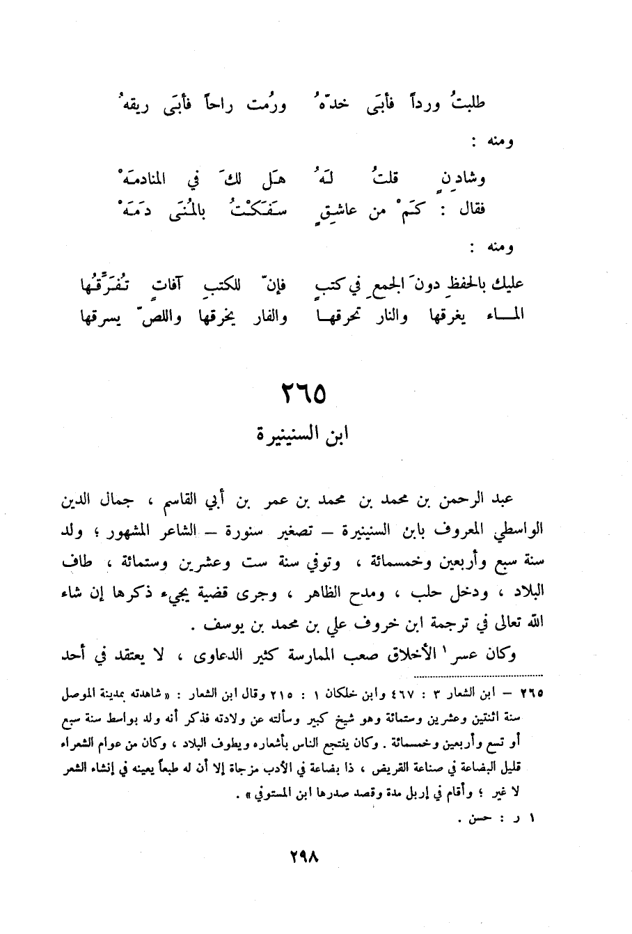 عبد الرحمن بن محمد بن محمد بن عمر بن أبي القاسم، جمال الدين الواسطي المعروف بابن السنينيرة - تصغير سنورة - الشاعر المشهور؛ ولد سنة سبع وأربعين وخمسمائة، وتوفي سنة ست وعشرين وستمائة، طاف البلاد، ودخل حلب، ومدح الظاهر، وجرى قضية يجيء ذكرها إن شاء الله تعالى في ترجمة ابن خروف علي بن محمد بن يوسف.