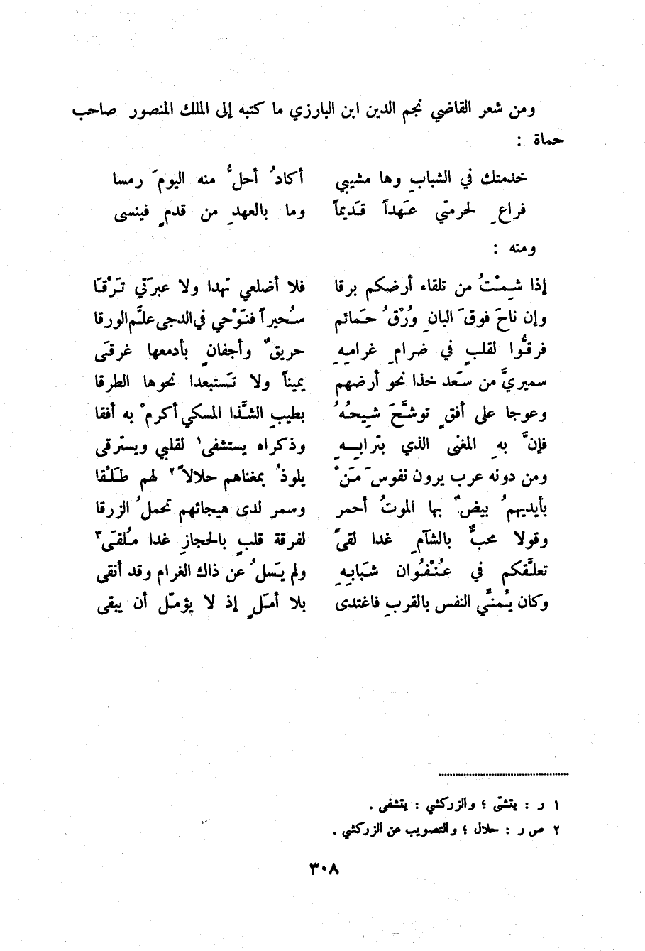 ومن شعر القاضي نجم الدين ابن البارزي ما كتبه إلى الملك المنصور صاحب حماة: