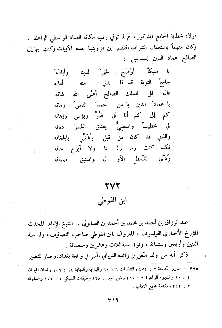 عبد الرزاق بن أحمد بن محمد بن أحمد بن الصابوني، الشيخ الإمام المحدث المؤرخ الأخباري الفيلسوف، المعروف بابن الفوطي صاحب التصانيف؛ ولد سنة اثنتين وأربعين وستمائة، وتوفي سنة ثلاث وعشرين وسبعمائة.
