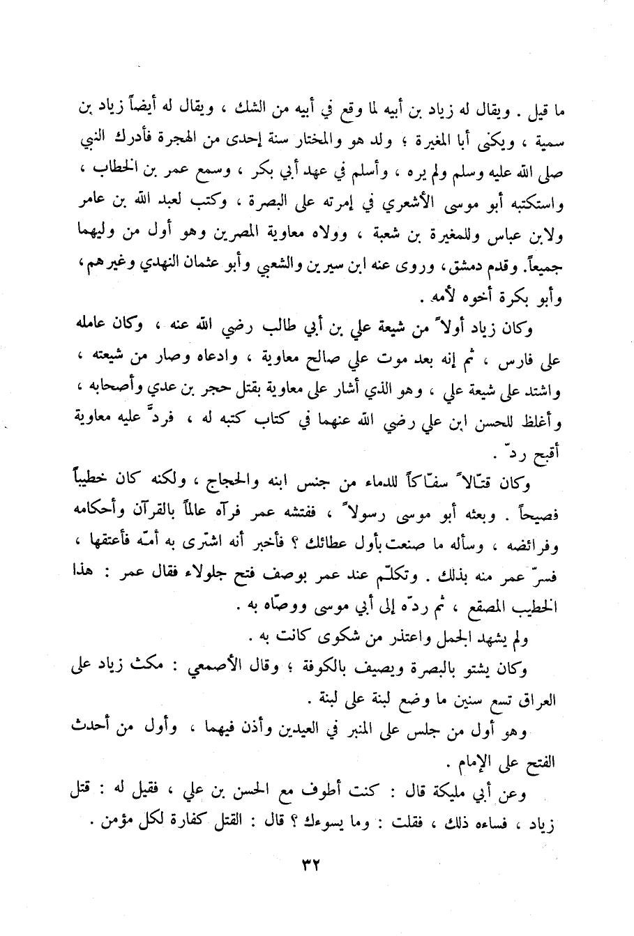 ما قيل. ويقال له زياد بن أبيه لما وقع في أبيه من الشك، ويقال له أيضاً زياد بن سمية، ويكنى أبا المغيرة؛ ولد هو والمختار سنة إحدى من الهجرة فأدرك النبي صلى الله عليه وسلم ولم يره، وأسلم في عهد أبي بكر، وسمع عمر بن الخطاب، واستكتبه أبو موسى الأشعري في إمرته على البصرة، وكتب لعبد الله بن عامر ولابن عباس وللمغيرة بن شعبة، وولاه معاوية المصرين وهو أول من وليهما جميعاً. وقدم دمشق، وروى عنه ابن سيرين والشعبي وأبو عثمان النهدي وغيرهم، وأبو بكرة أخوه لأمه.