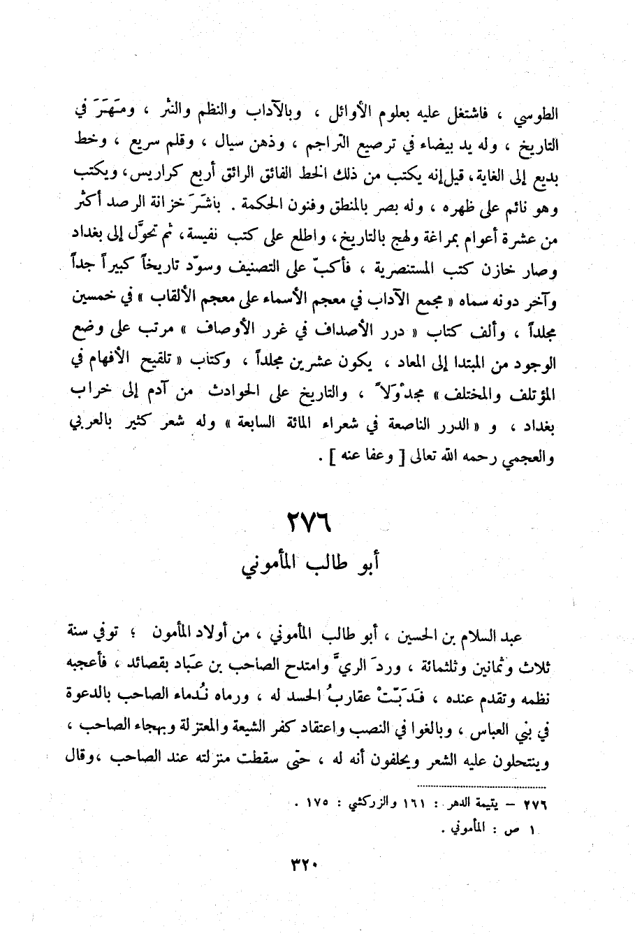عبد السلام بن الحسين، أبو طالب المأموني (2) ، من أولاد المأمون؛ توفي سنة ثلاث وثمانين وثلثمائة، ورد الري وامتدح الصاحب بن عباد بقصائد، فأعجبه نظمه وتقدم عنده، فدبت عقارب الحسد له، ورماه ندماء الصاحب بالدعوة في بني العباس، وبالغوا في النصب واعتقاد كفر الشيعة والمعتزلة وبهجاء الصاحب، وينتحلون عليه الشعر ويحلفون انه له، حتى سقطت منزلته عند الصاحب، وقال