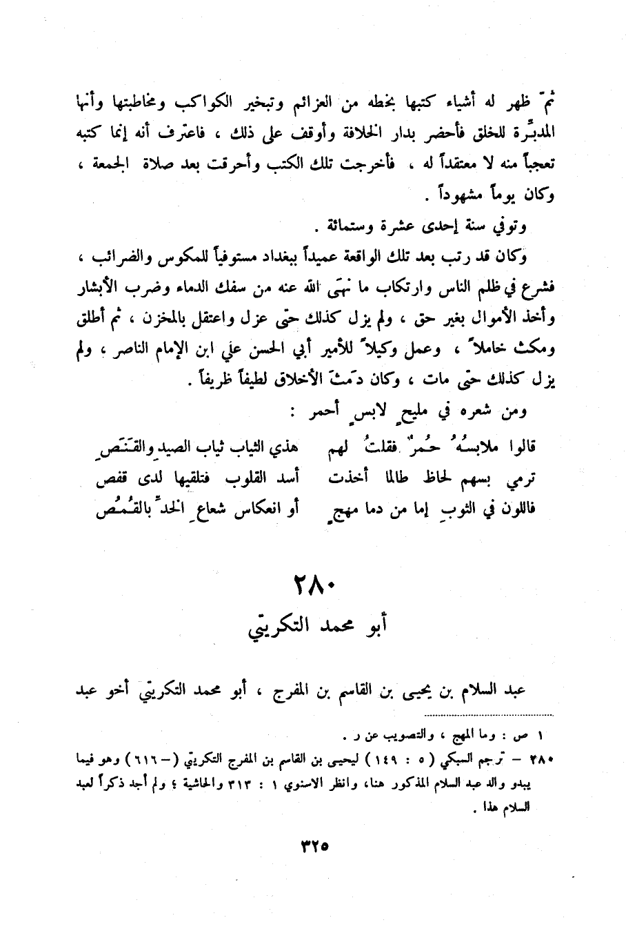 (2) ترجم السبكي (5: 149) ليحيى بن القاسم بن المفرج التكريتي (- 616) وهو فيما يبدو والد عبد السلام المذكور هنا، وانظر الاسنوي 1: 313 والحاشية؛ ولم أجد ذكراً لعبد السلام هذا.