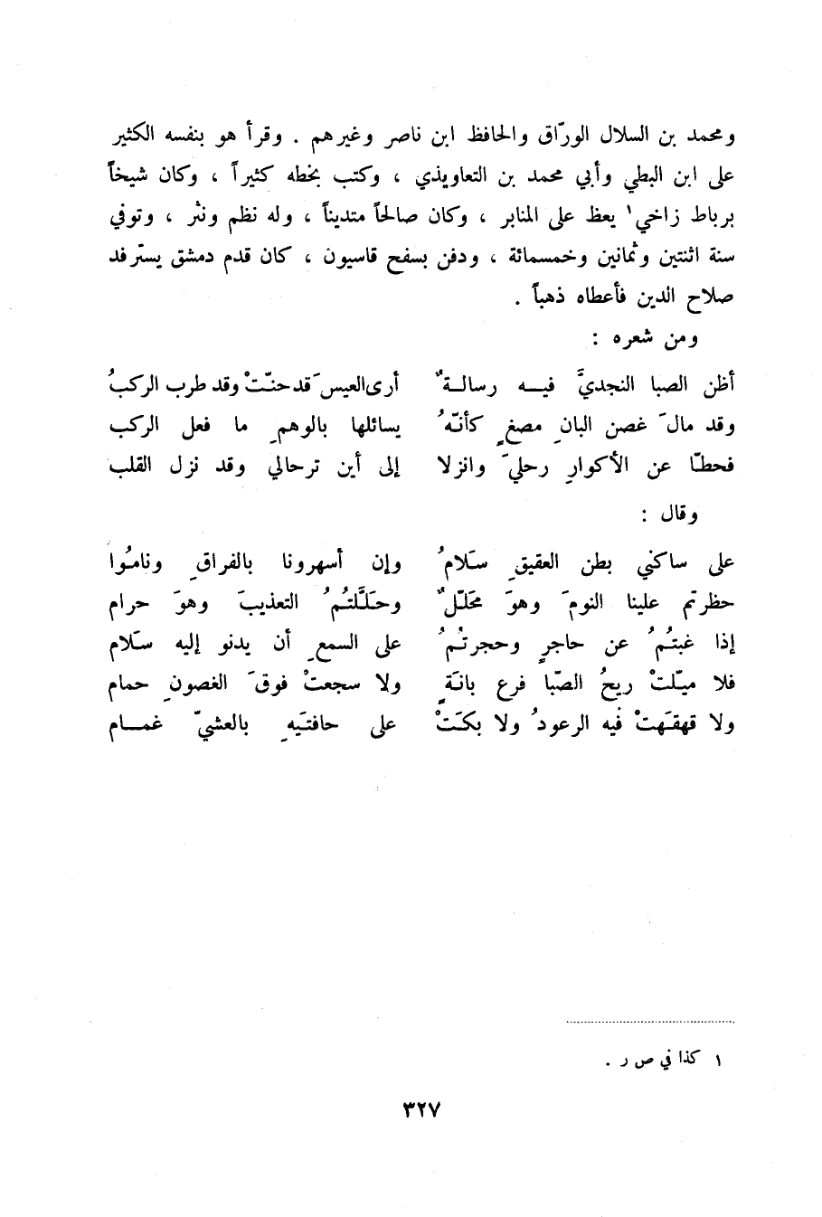 ومحمد بن السلال الوراق والحافظ ابن ناصر وغيرهم. وقرأ هو بنفسه الكثير على ابن البطي وأبي محمد بن التعاويذي، وكتب بخطه كثيراً، وكان شيخاً برباط زاخي (1) يعظ على المنابر، وكان صالحاً متديناً، ولم نظم ونثر، وتوفي سنة اثنتين وثمانين وخمسمائة، ودفن بسفح قاسيون، كان قدم دمشق يسترفد صلاح الدين فأعطاه ذهباً.