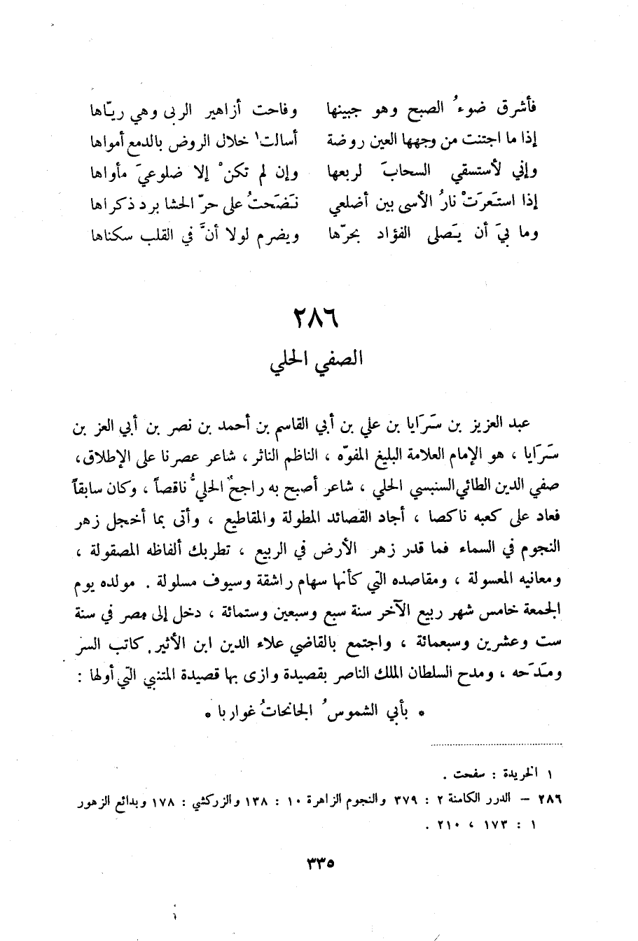 عبد العزيز بن سرايا بن علي بن أبي القاسم بن أحمد بن نصر بن أبي العز بن سرايا، هو الإمام العلامة البليغ المفوه، الناظم الناثر، شاعر عصرنا على الإطلاق، صفي الدين الطائي السنبسي الحلي، شاعر أصبح به راحج الحلي ناقصاً، وكان سابقاً فعاد على كعبه ناكصا، أجاد القصائد المطولة والمقاطيع، وأتى بما أخجل زهر النجوم في السماء فما قدر زهر الأرض في الربيع، تطربك ألفاظه المصقولة، ومعانيه المعسولة، ومقاصده التي كأنها سهام راشقة وسيوف مسلولة. مولده يوم الجمعة خامس شهر ربيع الآخر سنة سبع وسبعين وستمائة، دخل إلى مصر في سنة ست وعشرين وسبعمائة، واجتمع بالقاضي علاء الدين ابن الأثير كاتب السر ومدحه، ومدح السلطان الملك الناصر بقصيدة وازى بها قصيدة المتنبي التي أولها:
