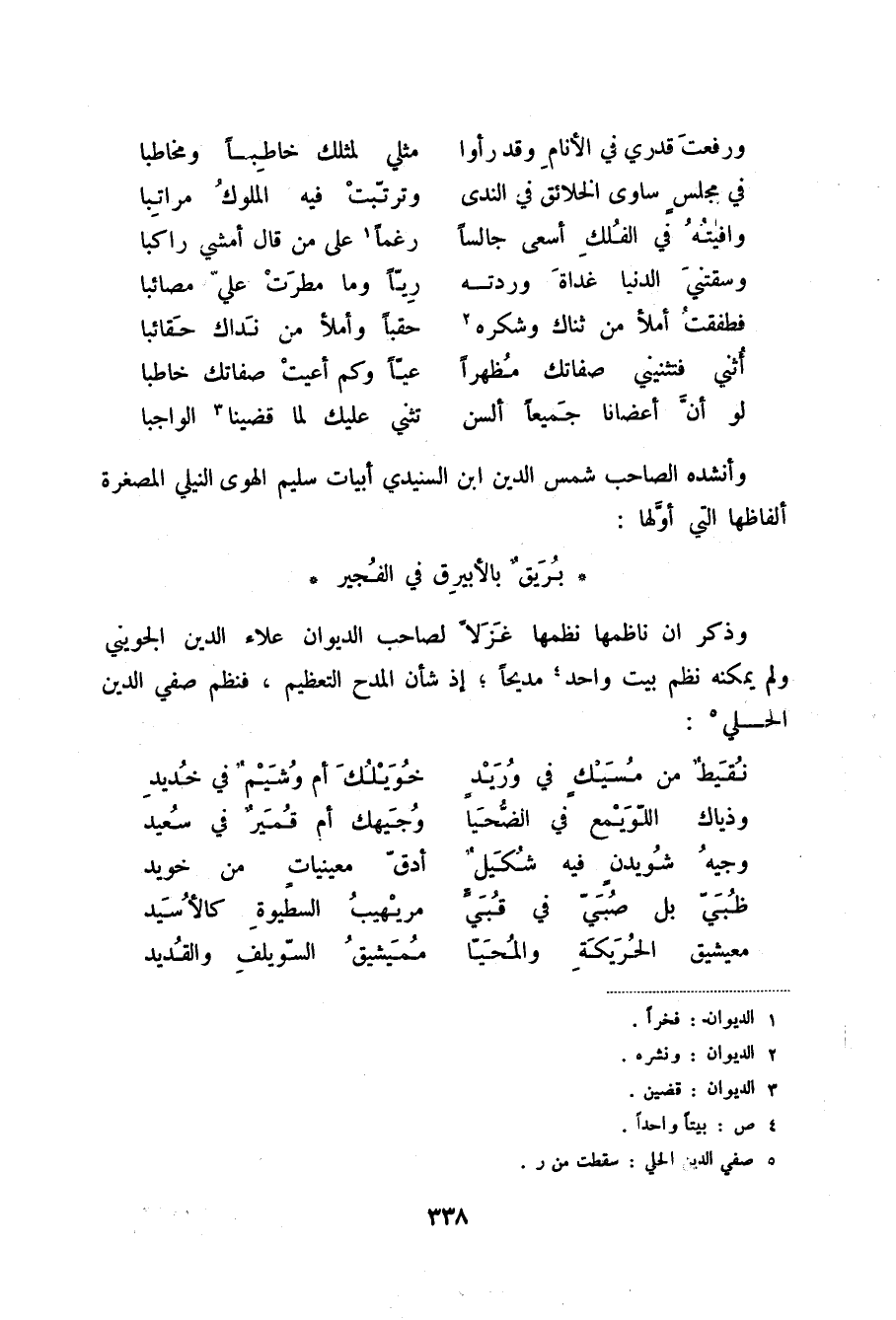 بريق بالأبيرق في الفجير ... وذكر أن ناظمها نظمها غزلاً لصاحب الديوان علاء الدين الجويني ولم يمكنه نظم بيت واحد (4) مديحاً؛ إذ شأن المدح التعظيم، فنظم صفي الدين الحلي (5) :