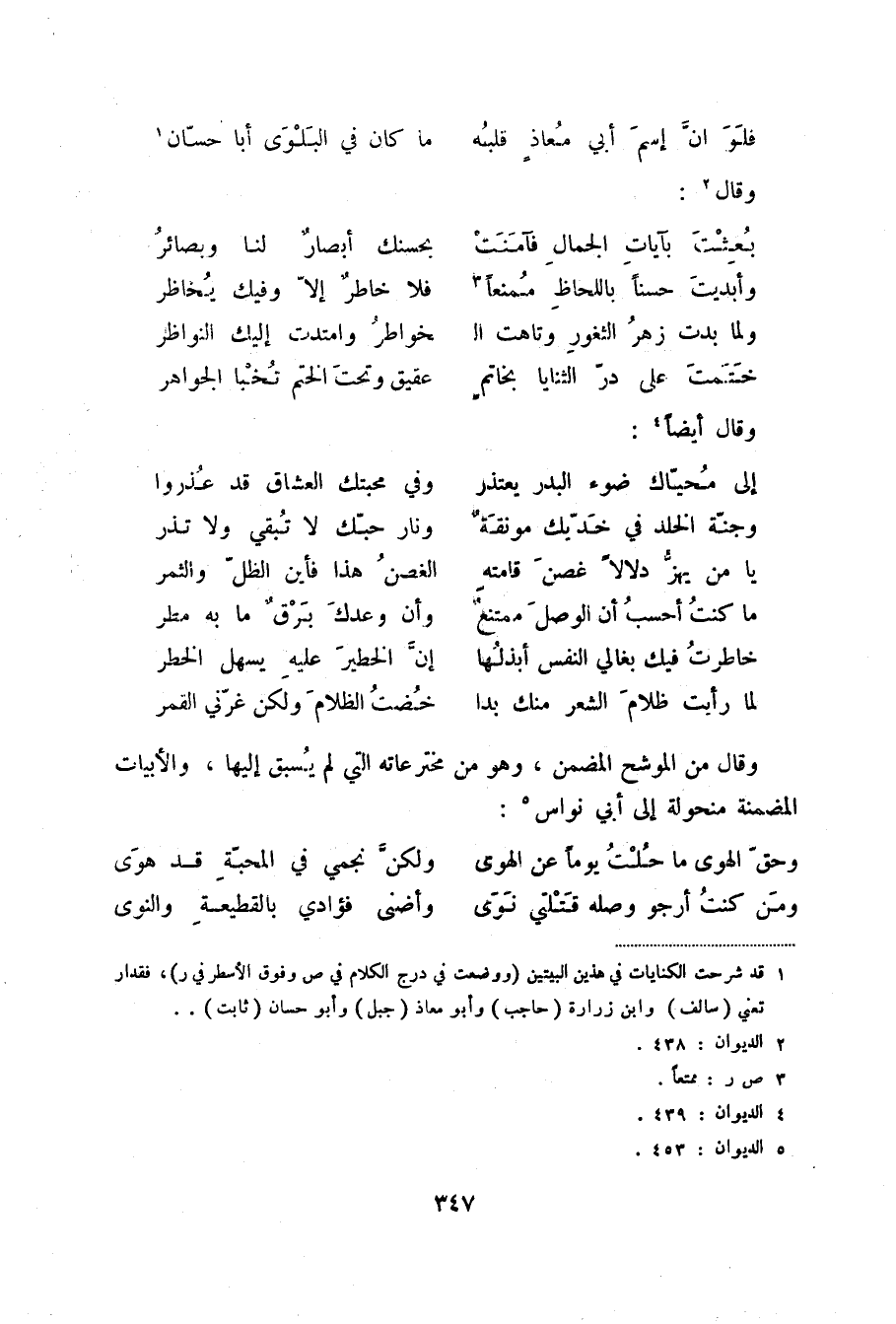 لما رأيت ظلام الشعر منك بدا ... خضت الظلام ولكن غرني القمر وقال من الموشح المضمن، وهو من مخترعاته التي لم يسبق إليها، والأبيات المضمنة منحولة إلى أبي نواس (5) :